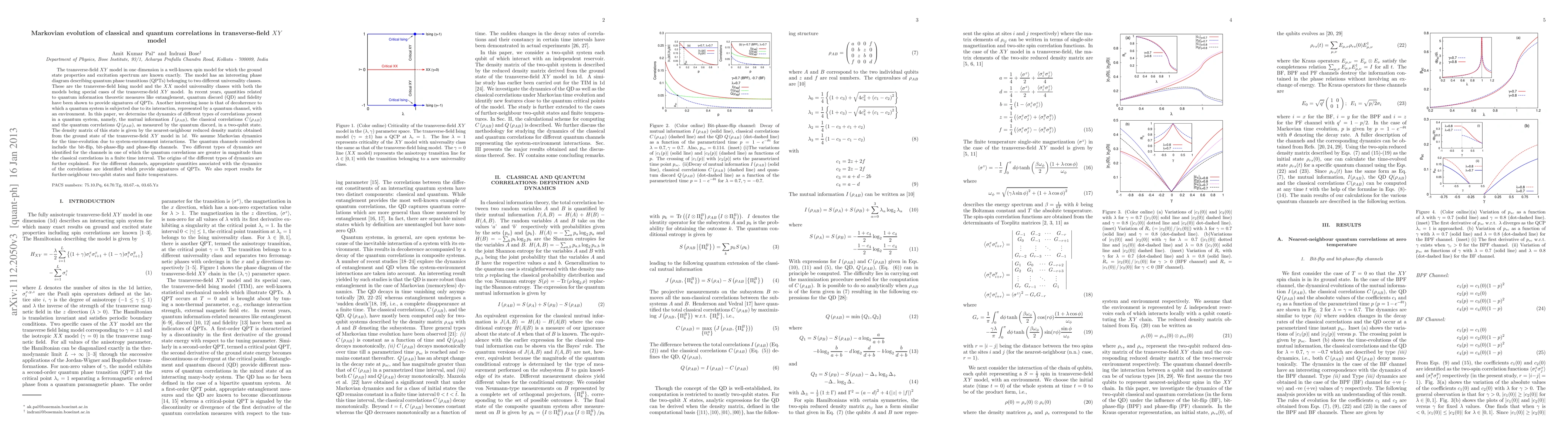 This paper investigates the Markovian evolution of classical and quantum correlations in the transverse-field XY model, identifying distinct dynamics for different quantum channels. It reveals that quantum correlations can exceed classical correlations over a finite time interval, providing insights into the signatures of quantum phase transitions.