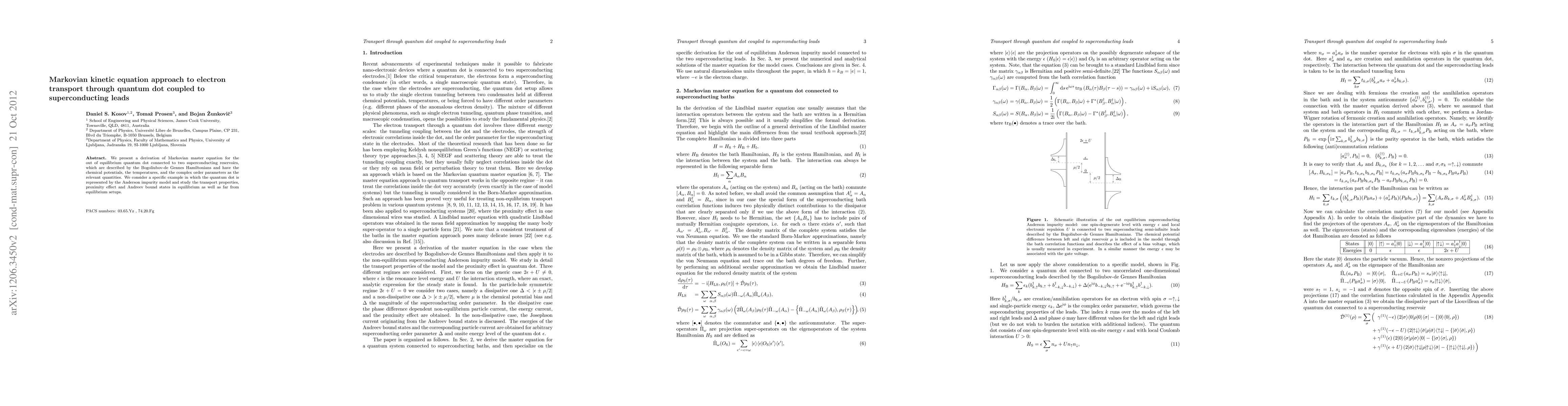 This paper derives a Markovian master equation for electron transport in a quantum dot connected to superconducting leads, focusing on the Anderson impurity model. It examines transport properties, proximity effects, and Andreev bound states under both equilibrium and non-equilibrium conditions.