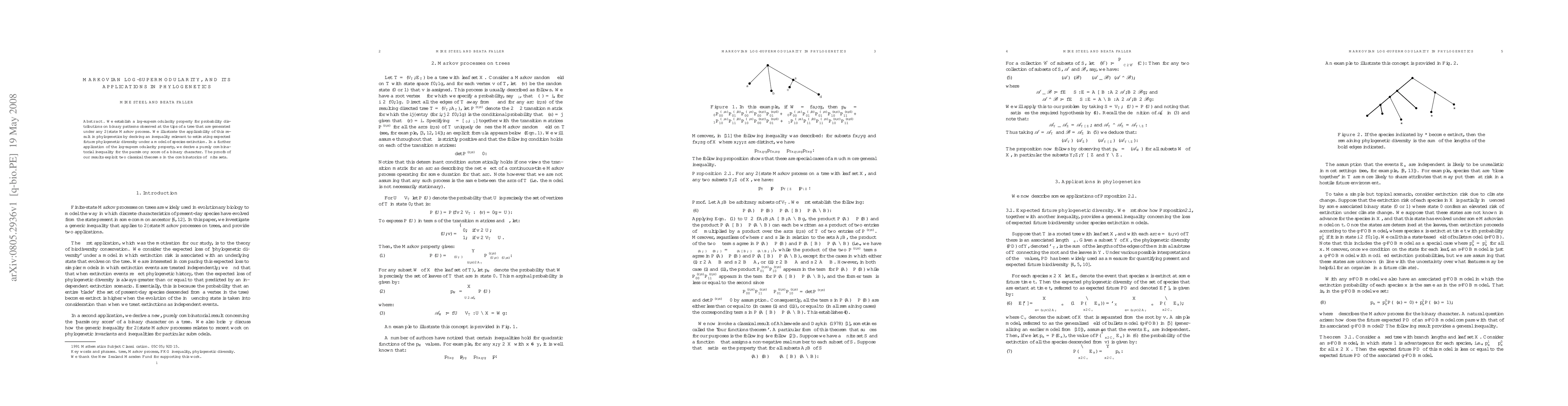We establish a log-supermodularity property for probability distributions on binary patterns observed at the tips of a tree that are generated under any 2--state Markov process. We illustrate the applicability of this result in phylogenetics by deriving an inequality relevant to estimating expected future phylogenetic diversity under a model of species extinction. In a further application of the log-supermodularity property, we derive a purely combinatorial inequality for the parsimony score of a binary character. The proofs of our results exploit two classical theorems in the combinatorics of finite sets.