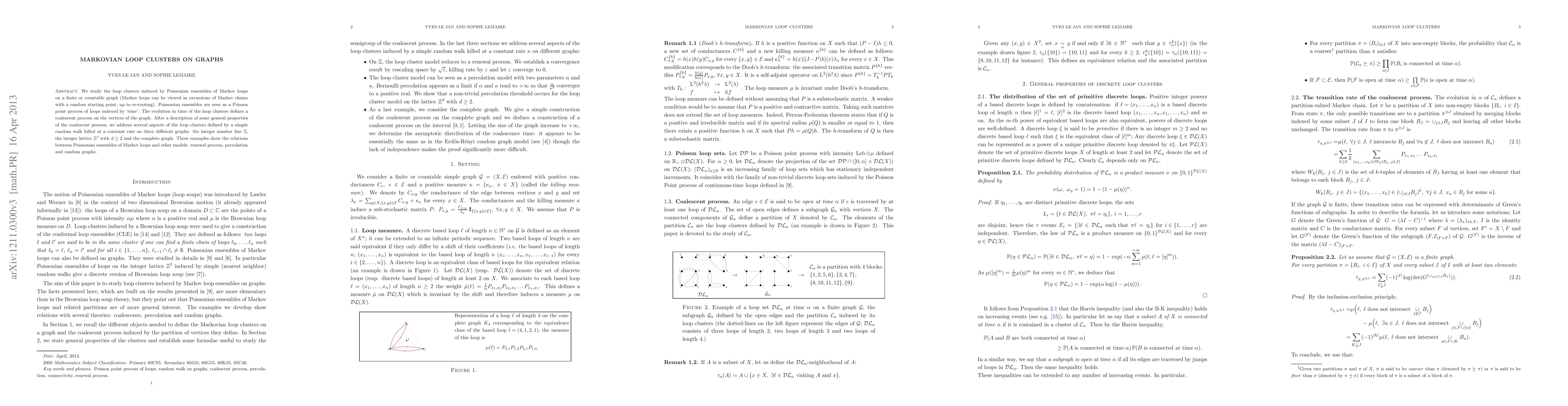 We study the loop clusters induced by Poissonian ensembles of Markov loops on a finite or countable graph (Markov loops can be viewed as excursions of Markov chains with a random starting point, up to re-rooting). Poissonian ensembles are seen as a Poisson point process of loops indexed by 'time'. The evolution in time of the loop clusters defines a coalescent process on the vertices of the graph. After a description of some general properties of the coalescent process, we address several aspects of the loop clusters defined by a simple random walk killed at a constant rate on three different graphs: the integer number line $\mathbb{Z}$, the integer lattice $\mathbb{Z}^d$ with $d\geq 2$ and the complete graph. These examples show the relations between Poissonian ensembles of Markov loops and other models: renewal process, percolation and random graphs.