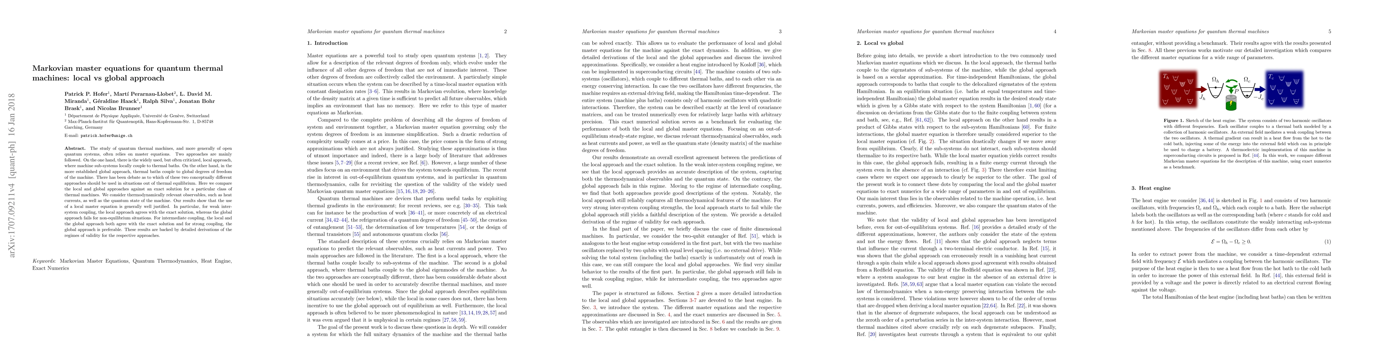 The study of quantum thermal machines, and more generally of open quantum systems, often relies on master equations. Two approaches are mainly followed. On the one hand, there is the widely used, but often criticized, local approach, where machine sub-systems locally couple to thermal baths. On the other hand, in the more established global approach, thermal baths couple to global degrees of freedom of the machine. There has been debate as to which of these two conceptually different approaches should be used in situations out of thermal equilibrium. Here we compare the local and global approaches against an exact solution for a particular class of thermal machines. We consider thermodynamically relevant observables, such as heat currents, as well as the quantum state of the machine. Our results show that the use of a local master equation is generally well justified. In particular, for weak inter-system coupling, the local approach agrees with the exact solution, whereas the global approach fails for non-equilibrium situations. For intermediate coupling, the local and the global approach both agree with the exact solution and for strong coupling, the global approach is preferable. These results are backed by detailed derivations of the regimes of validity for the respective approaches.