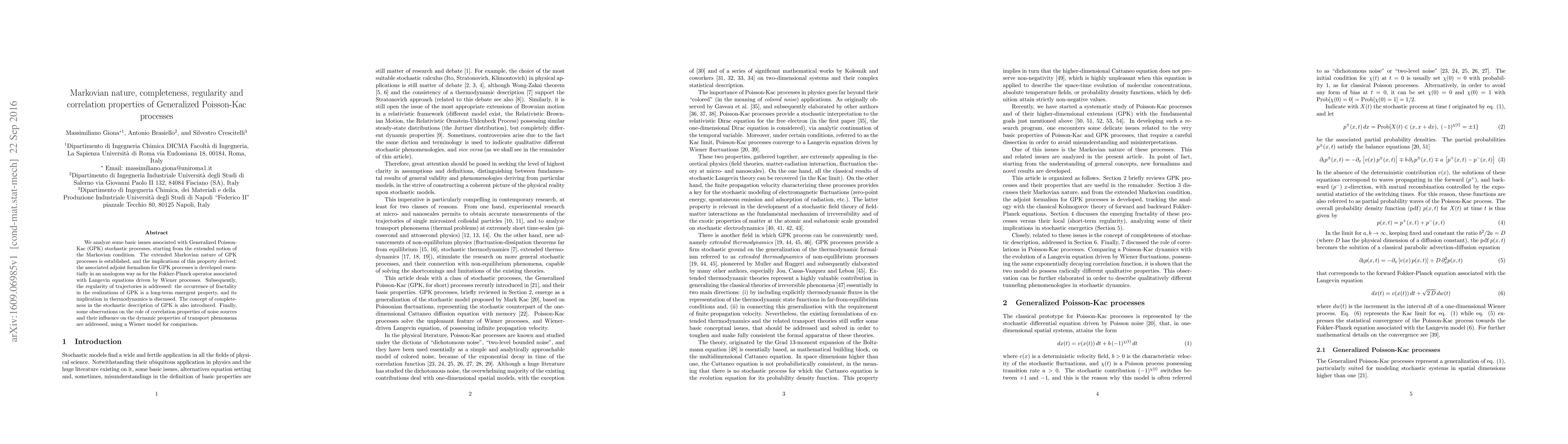 We analyze some basic issues associated with Generalized Poisson-Kac (GPK) stochastic processes, starting from the extended notion of the Markovian condition. The extended Markovian nature of GPK processes is established, and the implications of this property derived: the associated adjoint formalism for GPK processes is developed essentially in an analogous way as for the Fokker-Planck operator associated with Langevin equations driven by Wiener processes. Subsequently, the regularity of trajectories is addressed: the occurrence of fractality in the realizations of GPK is a long-term emergent property, and its implication in thermodynamics is discussed. The concept of completeness in the stochastic description of GPK is also introduced. Finally, some observations on the role of correlation properties of noise sources and their influence on the dynamic properties of transport phenomena are addressed, using a Wiener model for comparison.