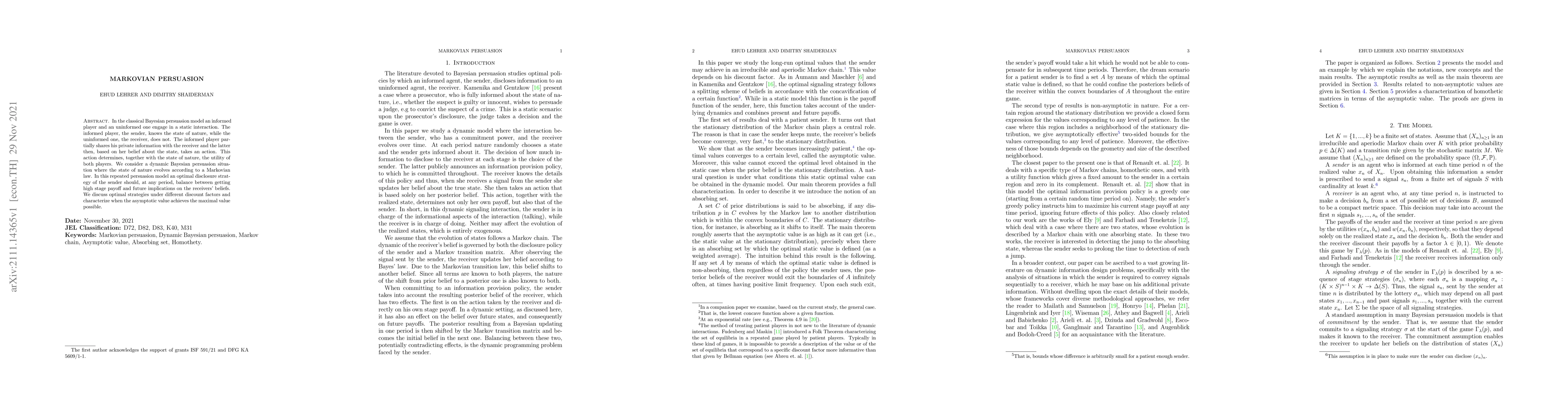 This paper explores dynamic Bayesian persuasion in a Markovian setting where the state of nature evolves over time. It examines optimal disclosure strategies for the sender, balancing immediate payoffs against future impacts on the receiver's beliefs, and characterizes conditions under which the optimal strategy maximizes long-term value.