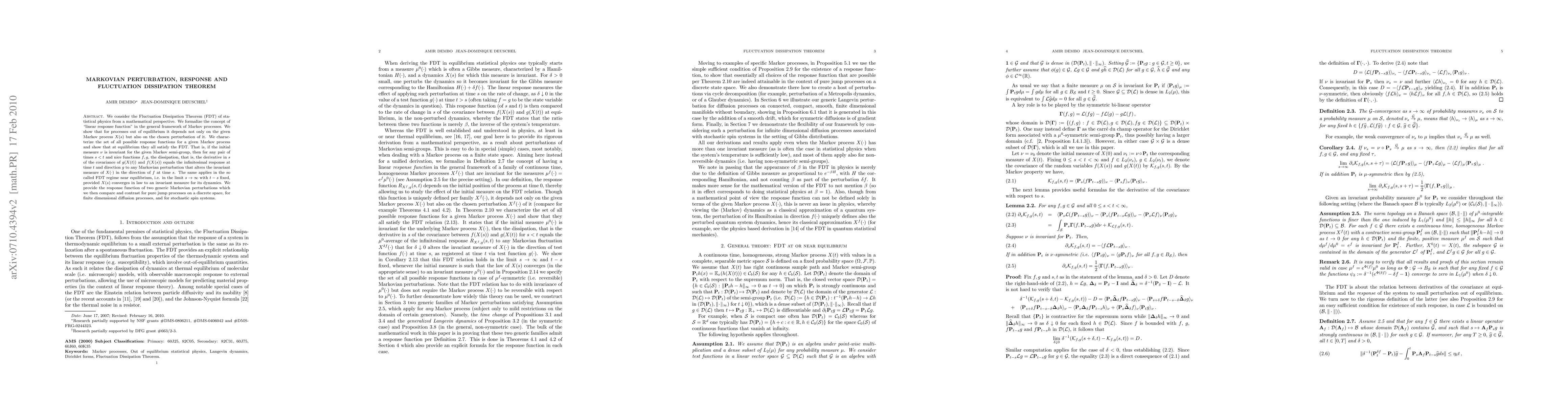This paper mathematically formalizes the Fluctuation Dissipation Theorem (FDT) within the context of Markov processes, demonstrating that the linear response function depends on both the Markov process and the chosen perturbation. It characterizes the set of response functions and shows that at equilibrium, they all satisfy the FDT, linking the dissipation to the infinitesimal response to Markovian perturbations.