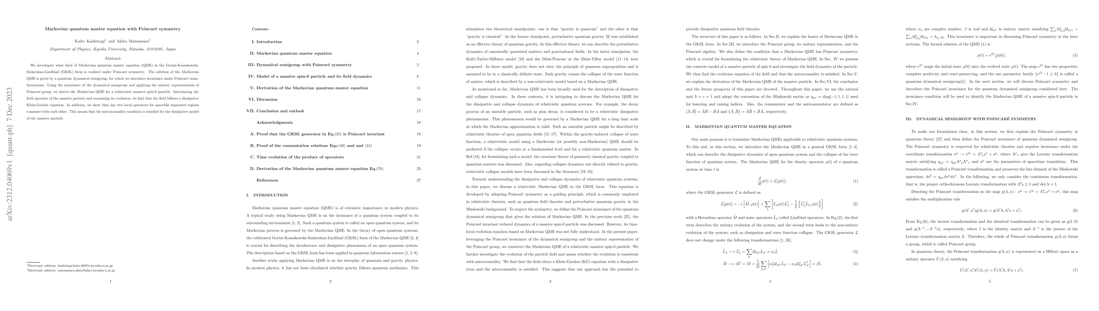 This paper derives a Markovian quantum master equation under Poincaré symmetry for a relativistic massive spin-0 particle, showing that the field follows a dissipative Klein-Gordon equation and that local operators in spacelike separated regions commute, satisfying the microcausality condition.