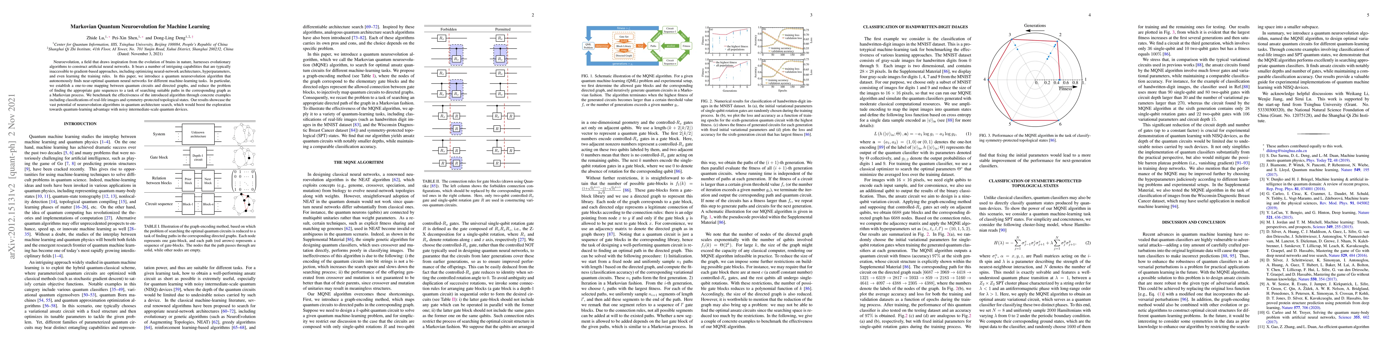 This paper proposes a quantum neuroevolution algorithm that autonomously discovers near-optimal quantum neural networks for machine learning tasks. It maps quantum circuits to directed graphs and uses a Markovian process to find suitable gate sequences, demonstrating effectiveness in image classification and topological state identification.