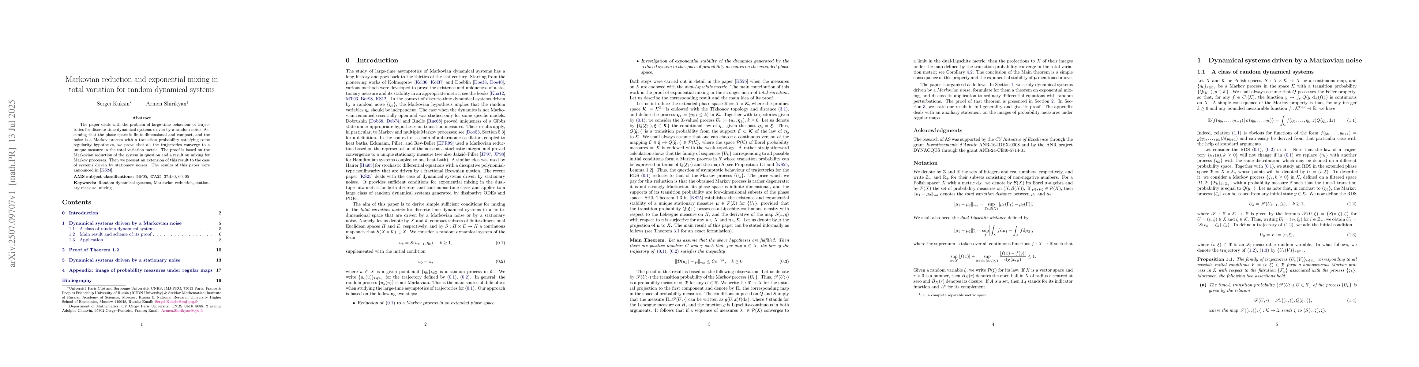 The paper deals with the problem of large-time behaviour of trajectories for discrete-time dynamical systems driven by a random noise. Assuming that the phase space is finite-dimensional and compact, and the noise is a Markov process with a transition probability satisfying some regularity hypotheses, we prove that all the trajectories converge to a unique measure in the total variation metric. The proof is based on the Markovian reduction of the system in question and a result on mixing for Markov processes. Then we present an extension of this result to the case of systems driven by stationary noises.