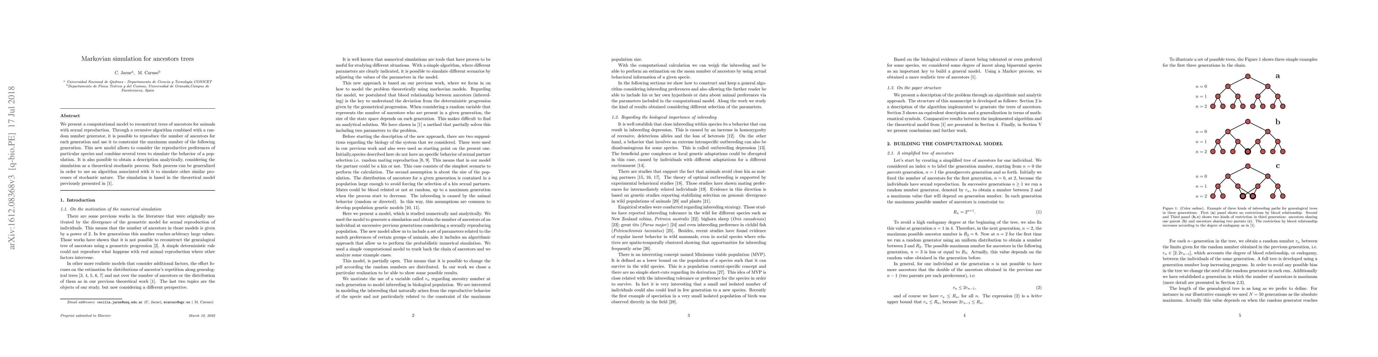 We present a computational model to reconstruct trees of ancestors for animals with sexual reproduction. Through a recursive algorithm combined with a random number generator, it is possible to reproduce the number of ancestors for each generation and use it to constraint the maximum number of the following generation. This new model allows to consider the reproductive preferences of particular species and combine several trees to simulate the behavior of a population. It is also possible to obtain a description analytically, considering the simulation as a theoretical stochastic process. Such process can be generalized in order to use an algorithm associated with it to simulate other similar processes of stochastic nature. The simulation is based in the theoretical model previously presented before.