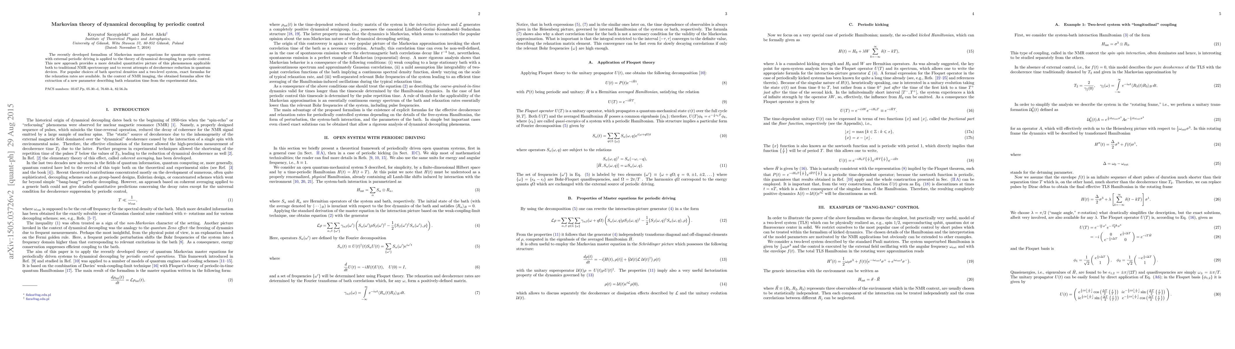 This paper applies Markovian master equations to dynamical decoupling by periodic control, offering a detailed quantitative framework for both NMR spectroscopy and quantum device decoherence reduction. It provides exact formulas for relaxation rates and introduces a new parameter for extracting bath relaxation time from NMR imaging data.