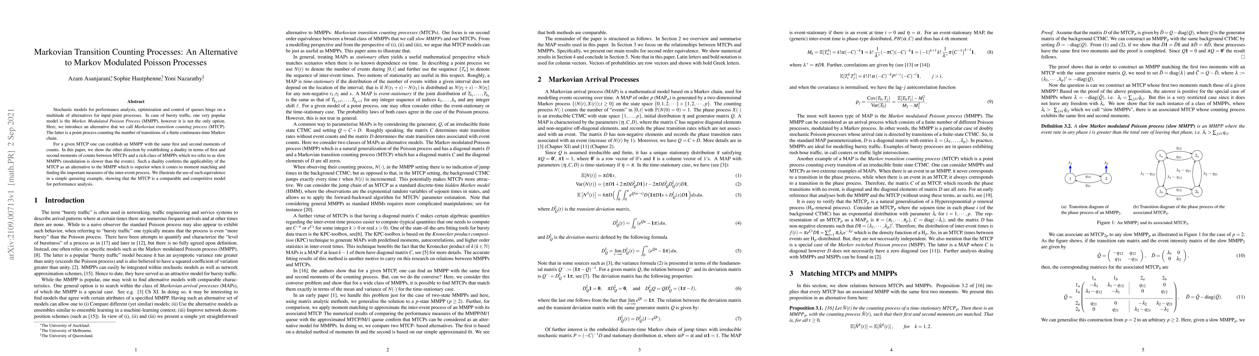 This paper introduces the Markovian transition counting process (MTCP) as an alternative to the Markov Modulated Poisson Process (MMPP) for modeling bursty traffic. It establishes a duality between MTCPs and a class of slow MMPPs, demonstrating that MTCPs can match the first and second moments of counts, making them a competitive model for performance analysis in queues.