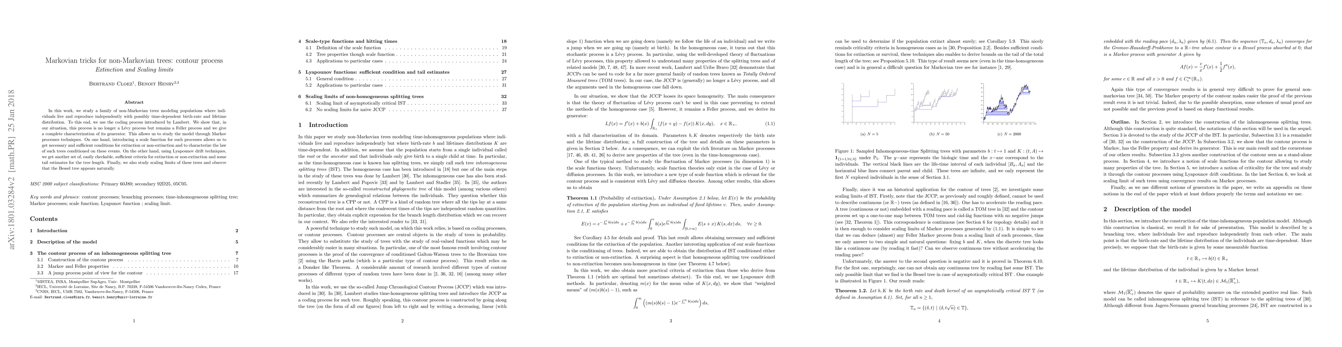 This research introduces a method to study non-Markovian trees using Markovian techniques, characterizing a Feller process generator. It provides criteria for extinction or non-extinction, tail estimates for tree length, and identifies the Bessel tree as a scaling limit. The methodology involves a coding process, scale functions, and Lyapunov drift techniques.