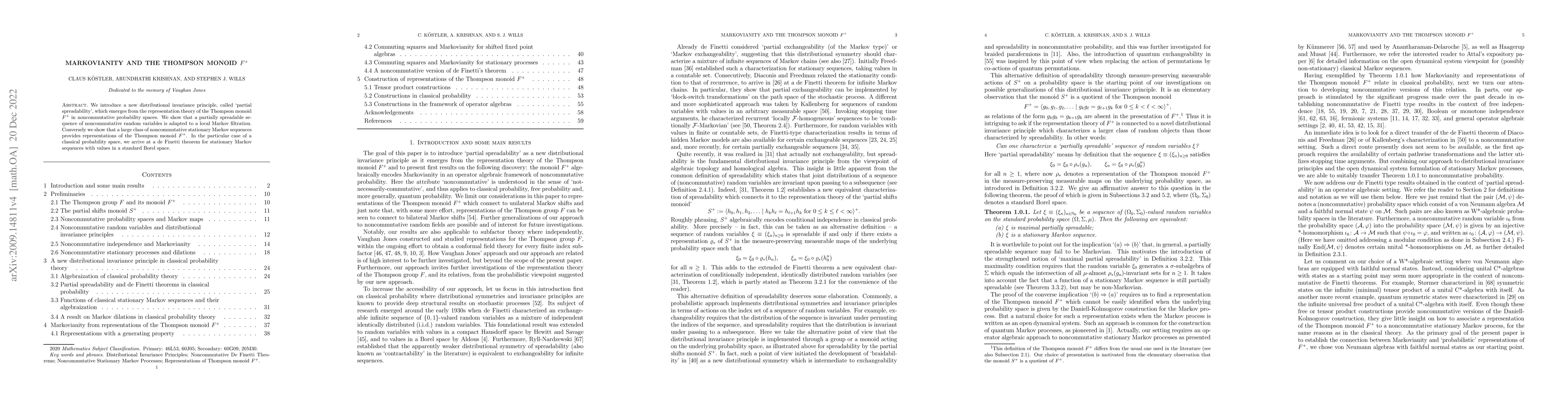 This paper introduces a new concept called `partial spreadability' from the Thompson monoid $F^+$'s representation theory, showing that it leads to sequences adapted to local Markov filtrations. It also demonstrates that many noncommutative stationary Markov sequences represent the Thompson monoid $F^+$, and in classical probability spaces, it results in a de Finetti theorem for such sequences.