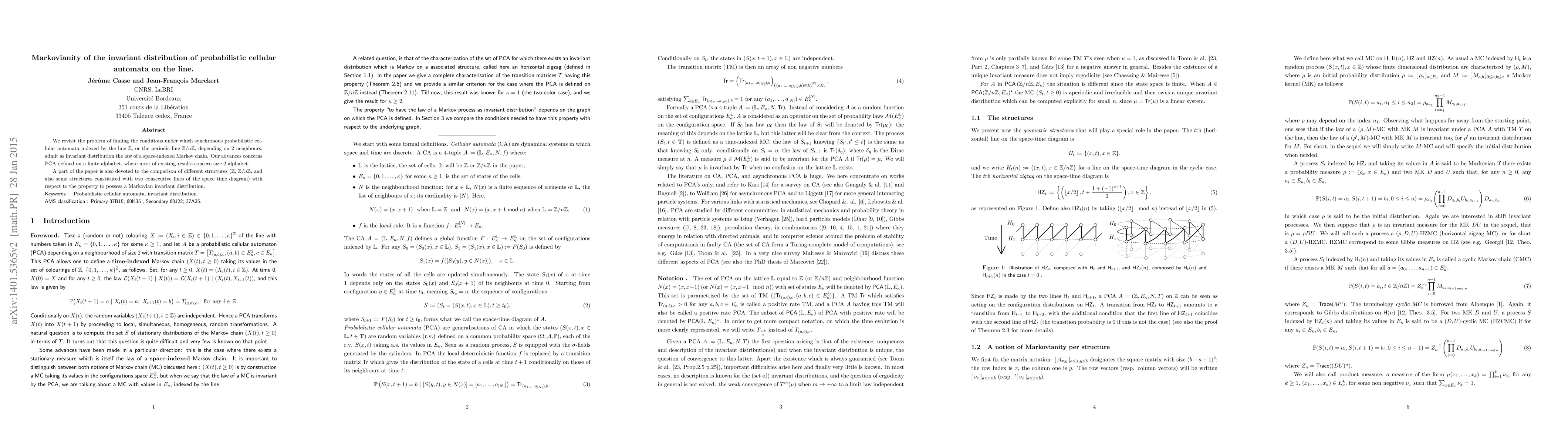 We revisit the problem of finding the conditions under which synchronous probabilistic cellular automata indexed by the line $\mathbb{Z}$, or the periodic line $\cyl{n}$, depending on 2 neighbours, admit as invariant distribution the law of a space-indexed Markov chain. Our advances concerns PCA defined on a finite alphabet, where most of existing results concern size 2 alphabet. A part of the paper is also devoted to the comparison of different structures ($\mathbb{Z}$, $\cyl{n}$, and also some structures constituted with two consecutive lines of the space time diagram) with respect to the property to possess a Markovian invariant distribution.