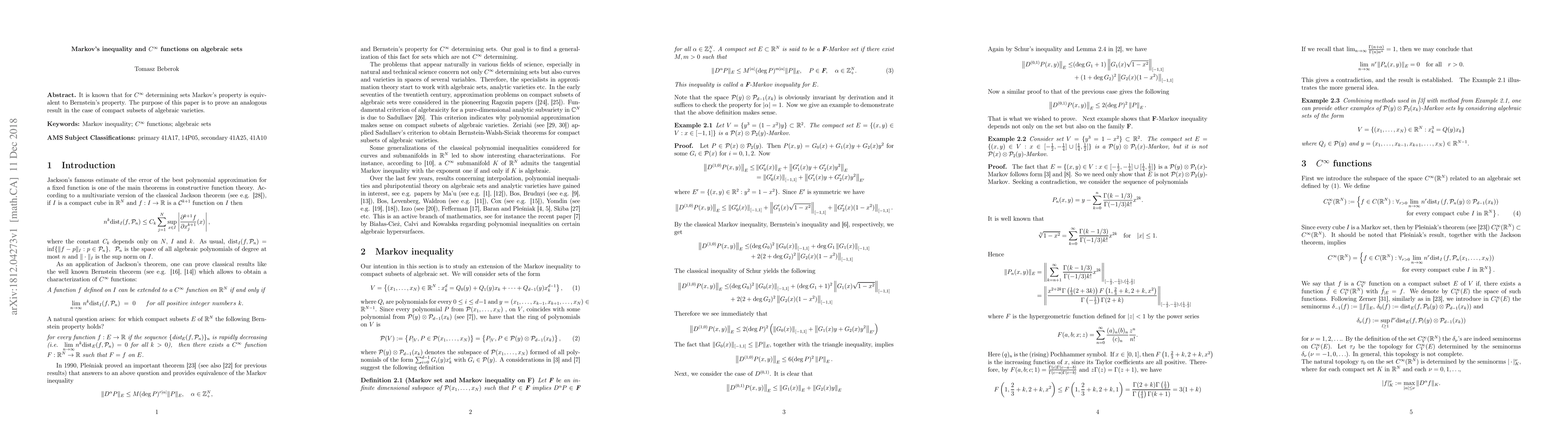 It is known that for $C^{\infty}$ determining sets Markov's property is equivalent to Bernstein's property. The purpose of this paper is to prove an analogous result in the case of compact subsets of algebraic varieties.