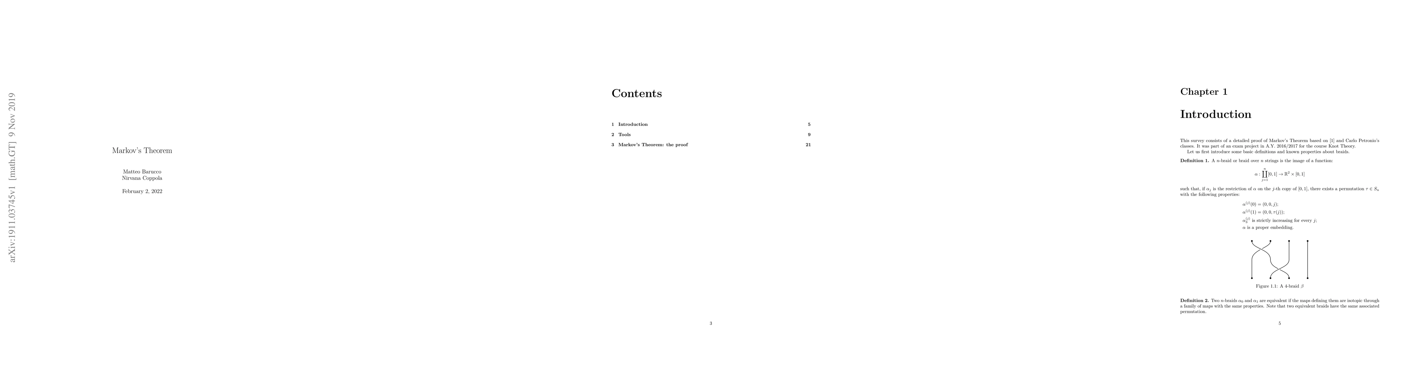 Summary: This survey presents a comprehensive proof of Markov's Theorem using concepts from Joan Birman's "Braids, Links, and Mapping Class Groups" and Carlo Petronio's teachings, serving as an exam project for the Knot Theory course in A.Y. 2016/2017. The paper elucidates intricate connections between braids, links, and mapping class groups.
