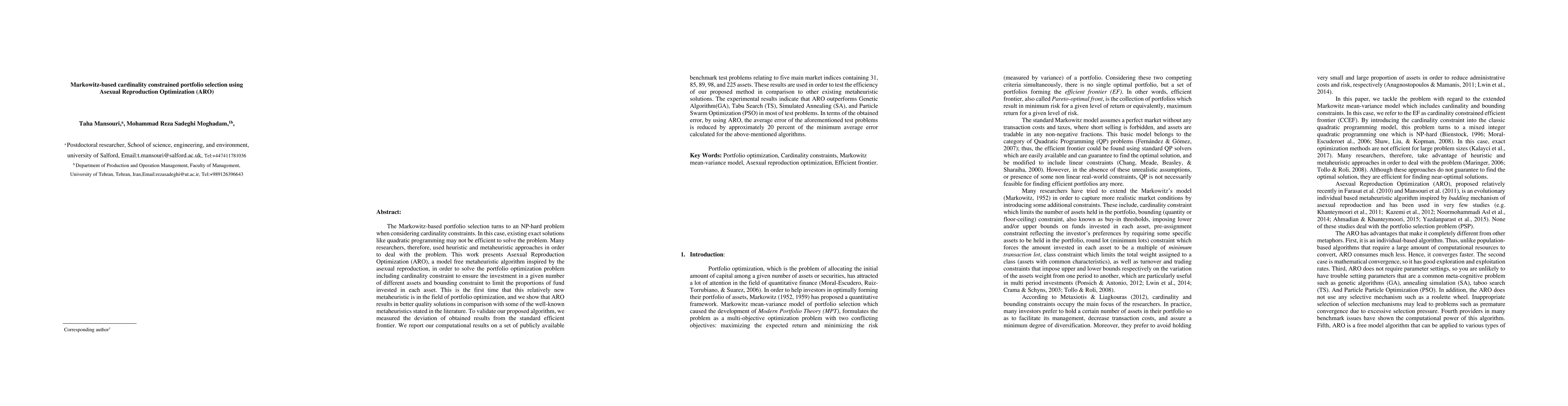 This paper introduces Asexual Reproduction Optimization (ARO), a novel metaheuristic inspired by asexual reproduction, to address the NP-hard problem of Markowitz-based portfolio selection with cardinality constraints. ARO outperforms existing metaheuristics like GA, TS, SA, and PSO in efficiency and solution quality, reducing the average error by approximately 20 percent.