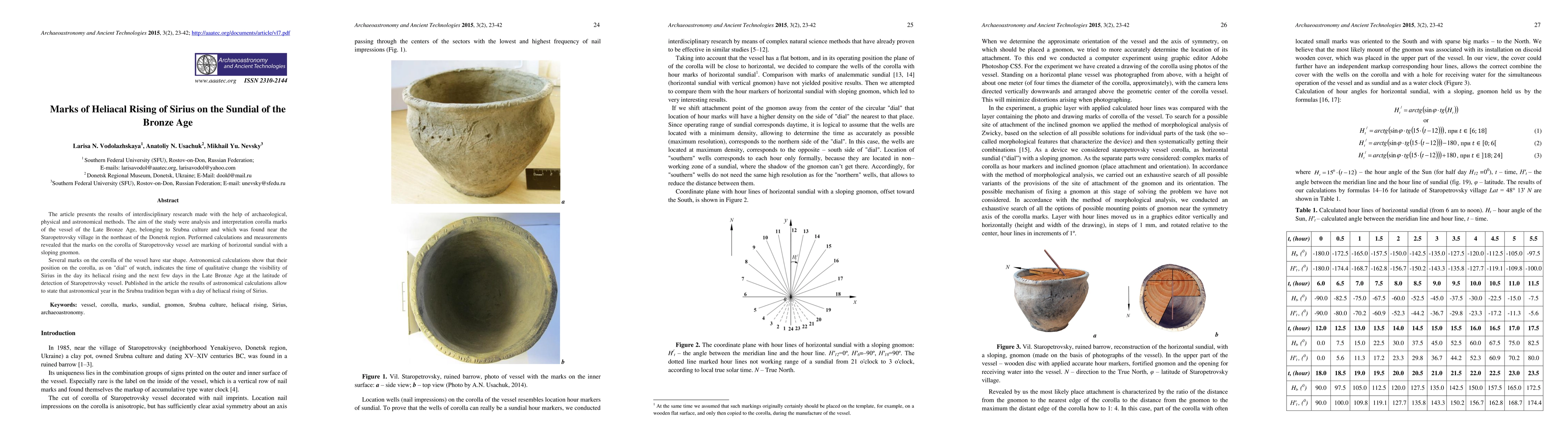 The article presents the results of interdisciplinary research made with the help of archaeological, physical and astronomical methods. The aim of the study were analysis and interpretation corolla marks of the vessel of the Late Bronze Age, belonging to Srubna culture and which was found near the Staropetrovsky village in the northeast of the Donetsk region (Central Donbass). Performed calculations and measurements revealed that the marks on the corolla of Staropetrovsky vessel are marking of horizontal sundial with a sloping gnomon. Several marks on the corolla of the vessel have star shape. Astronomical calculations show that their position on the corolla, as on "dial" of watch, indicates the time of qualitative change the visibility of Sirius in the day its heliacal rising and the next few days in the Late Bronze Age at the latitude of detection of Staropetrovsky vessel. Published in the article the results of astronomical calculations allow to state that astronomical year in the Srubna tradition began with a day of heliacal rising of Sirius. Vessel, corolla, marks, sundial, gnomon, Srubna culture, heliacal rising, Sirius, archaeoastronomy