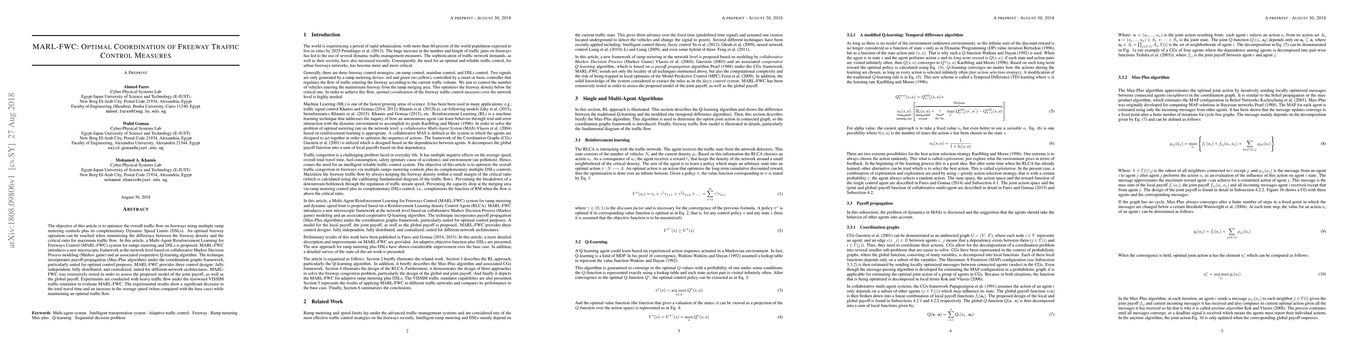 This paper proposes MARL-FWC, a Multi-Agent Reinforcement Learning system for optimizing freeway traffic flow through ramp metering and Dynamic Speed Limits. The system uses a collaborative Markov Decision Process and cooperative Q-learning to achieve optimal control, tested in VISSIM with significant reductions in travel time and increases in average speed.