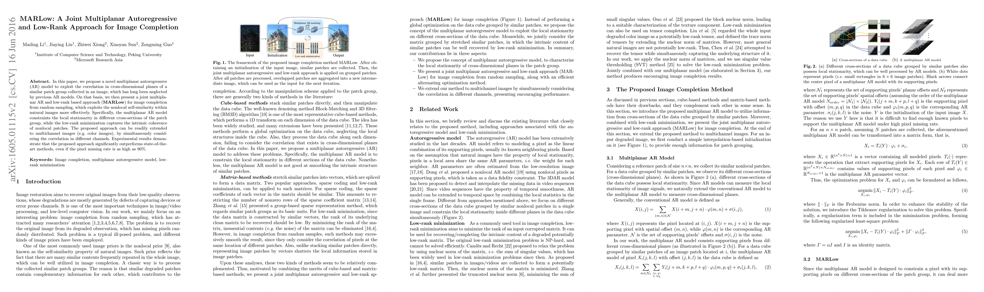In this paper, we propose a novel multiplanar autoregressive (AR) model to exploit the correlation in cross-dimensional planes of a similar patch group collected in an image, which has long been neglected by previous AR models. On that basis, we then present a joint multiplanar AR and low-rank based approach (MARLow) for image completion from random sampling, which exploits the nonlocal self-similarity within natural images more effectively. Specifically, the multiplanar AR model constraints the local stationarity in different cross-sections of the patch group, while the low-rank minimization captures the intrinsic coherence of nonlocal patches. The proposed approach can be readily extended to multichannel images (e.g. color images), by simultaneously considering the correlation in different channels. Experimental results demonstrate that the proposed approach significantly outperforms state-of-the-art methods, even if the pixel missing rate is as high as 90%.