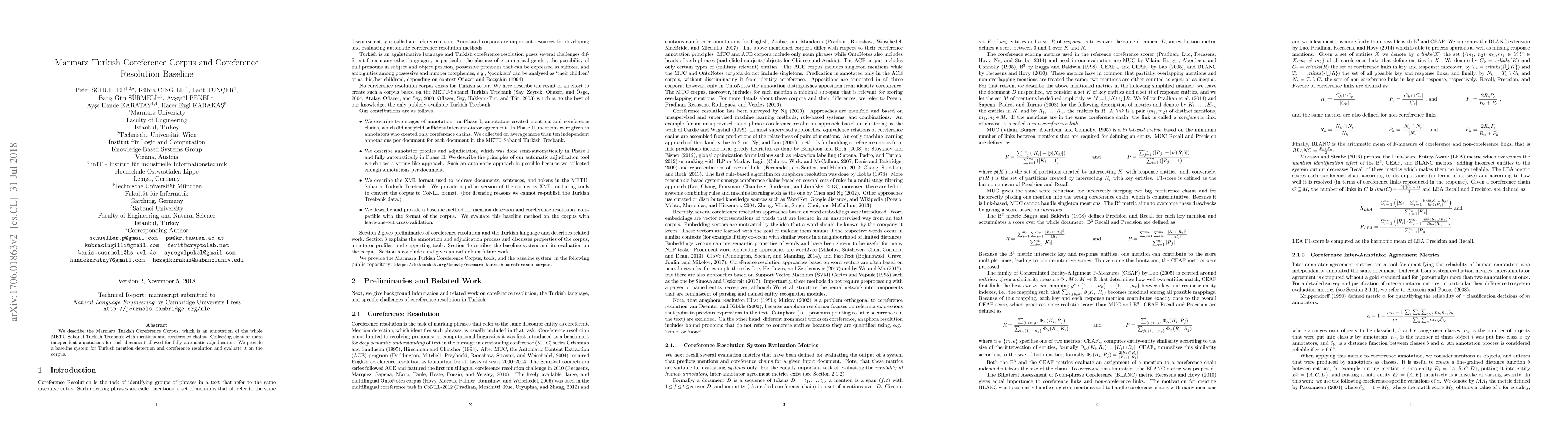 The Marmara Turkish Coreference Corpus is annotated with mentions and coreference chains from the METU-Sabanci Turkish Treebank, with multiple independent annotations enabling automatic adjudication. A baseline system for Turkish mention detection and coreference resolution is presented and evaluated on this corpus.