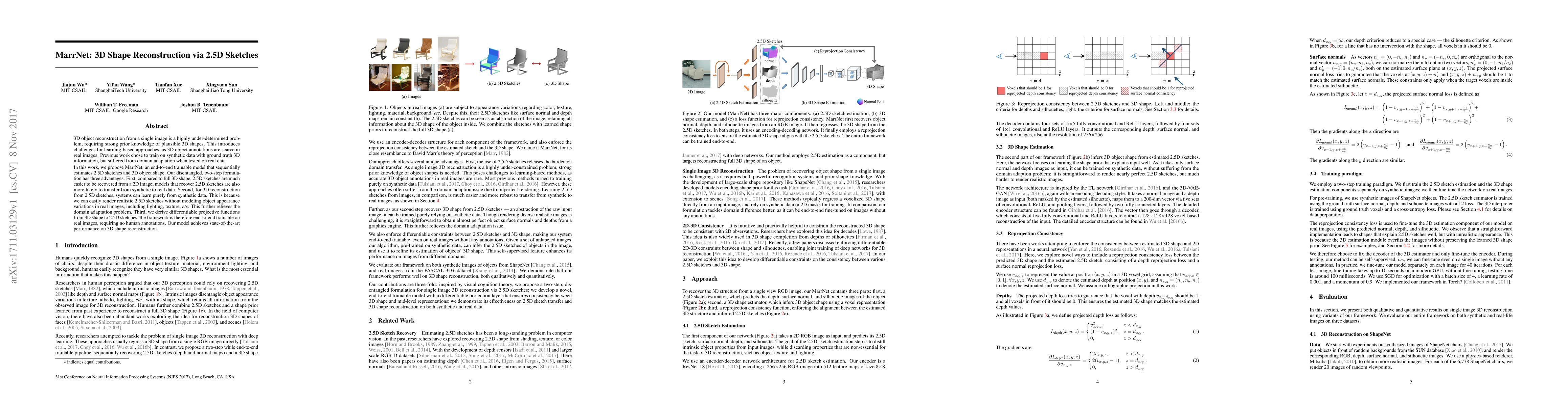 MarrNet proposes an end-to-end model for 3D shape reconstruction from single images by first estimating 2.5D sketches, which are easier to recover and transfer from synthetic to real data, followed by reconstructing 3D shapes from these sketches. This two-step approach leverages synthetic data for training while achieving state-of-the-art performance on real images.