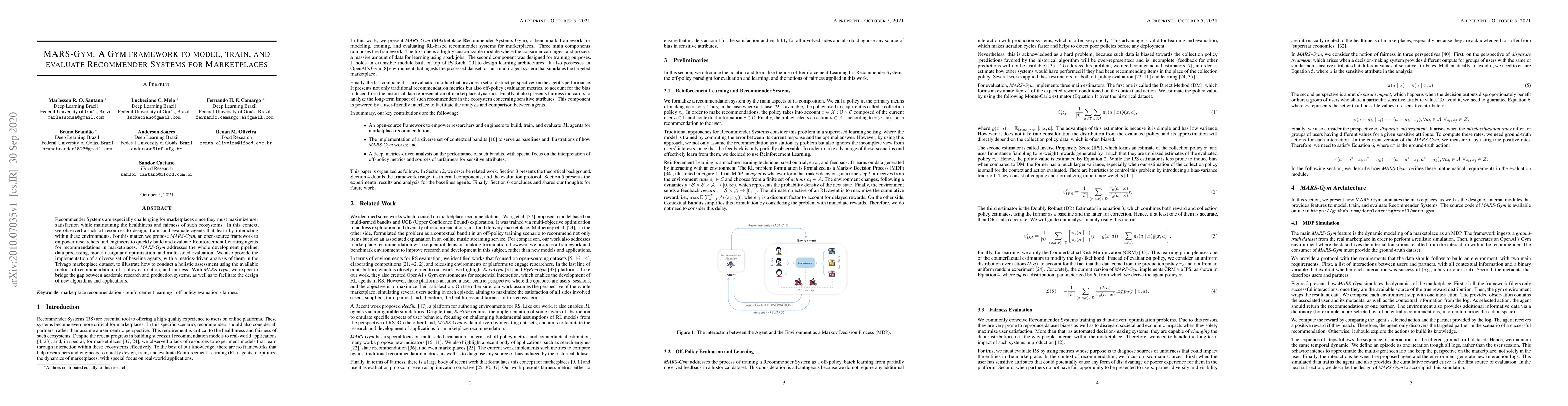 Recommender Systems are especially challenging for marketplaces since they must maximize user satisfaction while maintaining the healthiness and fairness of such ecosystems. In this context, we observed a lack of resources to design, train, and evaluate agents that learn by interacting within these environments. For this matter, we propose MARS-Gym, an open-source framework to empower researchers and engineers to quickly build and evaluate Reinforcement Learning agents for recommendations in marketplaces. MARS-Gym addresses the whole development pipeline: data processing, model design and optimization, and multi-sided evaluation. We also provide the implementation of a diverse set of baseline agents, with a metrics-driven analysis of them in the Trivago marketplace dataset, to illustrate how to conduct a holistic assessment using the available metrics of recommendation, off-policy estimation, and fairness. With MARS-Gym, we expect to bridge the gap between academic research and production systems, as well as to facilitate the design of new algorithms and applications.