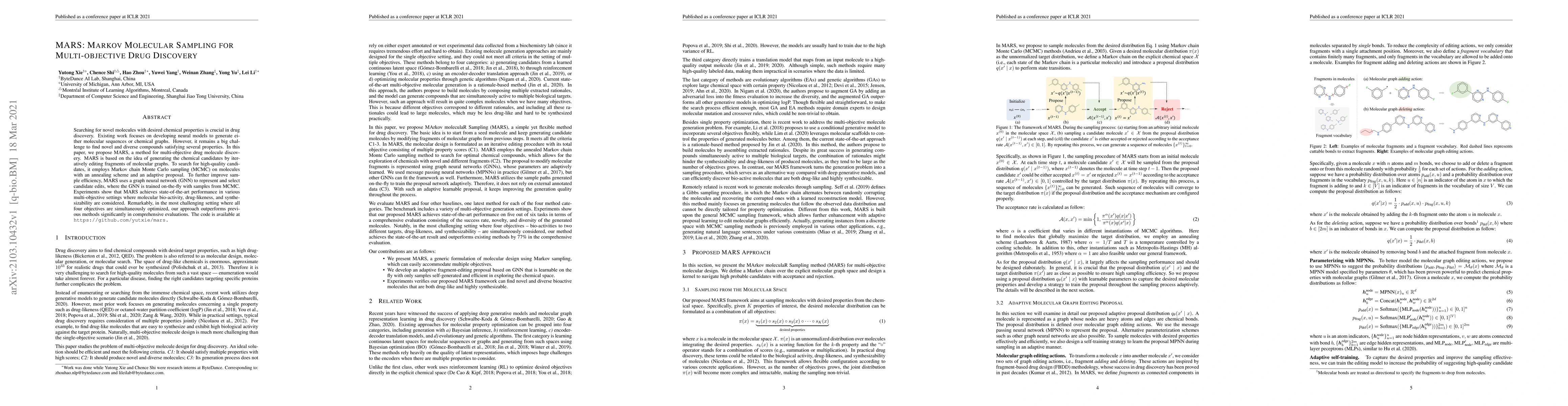 MARS proposes a novel method for multi-objective drug discovery by iteratively editing molecular graph fragments using Markov chain Monte Carlo sampling. The approach leverages a graph neural network for efficient candidate selection and outperforms previous methods in optimizing multiple properties simultaneously.