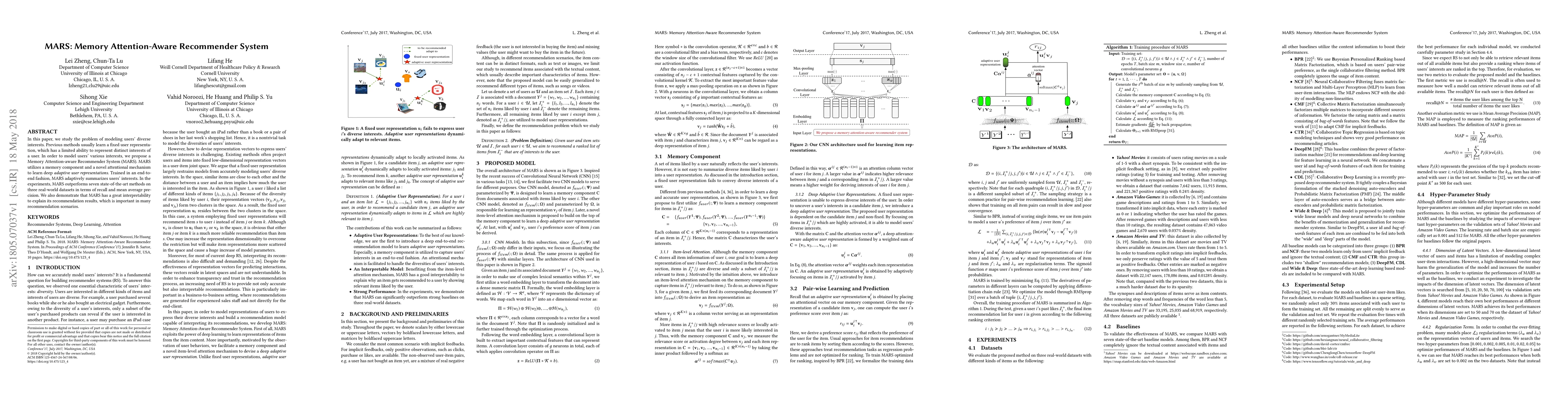 The MARS system proposes a Memory Attention-aware Recommender System to model users' diverse interests by learning adaptive user representations through a memory component and attentional mechanism. MARS outperforms existing methods on multiple datasets and offers interpretability for its recommendations.