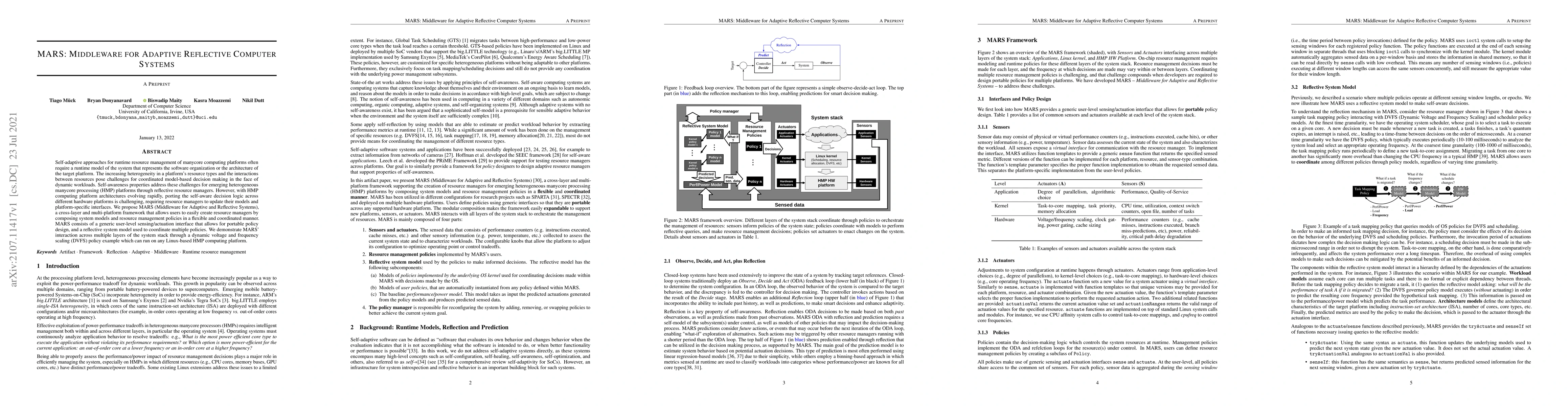 MARS is a proposed middleware framework for adaptive reflective systems that facilitates the creation of resource managers for heterogeneous manycore platforms. It enables flexible composition of system models and management policies, allowing for dynamic voltage and frequency scaling across different hardware architectures.