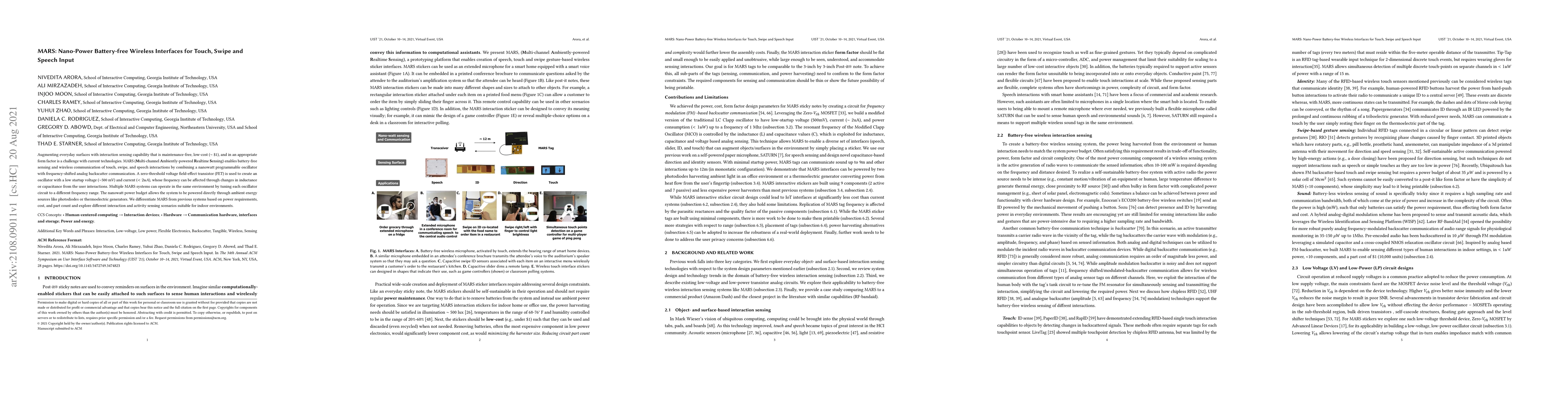 Augmenting everyday surfaces with interaction sensing capability that is maintenance-free, low-cost (about $1), and in an appropriate form factor is a challenge with current technologies. MARS (Multi-channel Ambiently-powered Realtime Sensing) enables battery-free sensing and wireless communication of touch, swipe, and speech interactions by combining a nanowatt programmable oscillator with frequency-shifted analog backscatter communication. A zero-threshold voltage field-effect transistor (FET) is used to create an oscillator with a low startup voltage (about 500 mV) and current (< 2uA), whose frequency can be affected through changes in inductance or capacitance from the user interactions. Multiple MARS systems can operate in the same environment by tuning each oscillator circuit to a different frequency range. The nanowatt power budget allows the system to be powered directly through ambient energy sources like photodiodes or thermoelectric generators. We differentiate MARS from previous systems based on power requirements, cost, and part count and explore different interaction and activity sensing scenarios suitable for indoor environments.