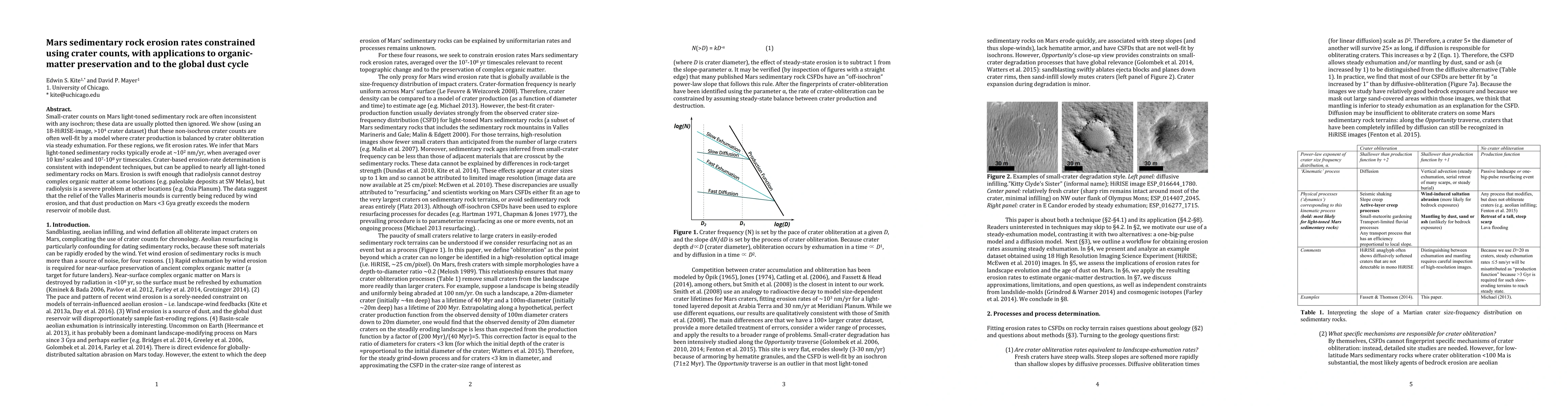 This study uses crater counts on Mars' light-toned sedimentary rocks to determine erosion rates, finding an average of ~10^2 nm/yr. The research suggests that erosion impacts organic matter preservation and indicates that ancient dust production was much higher than present levels.