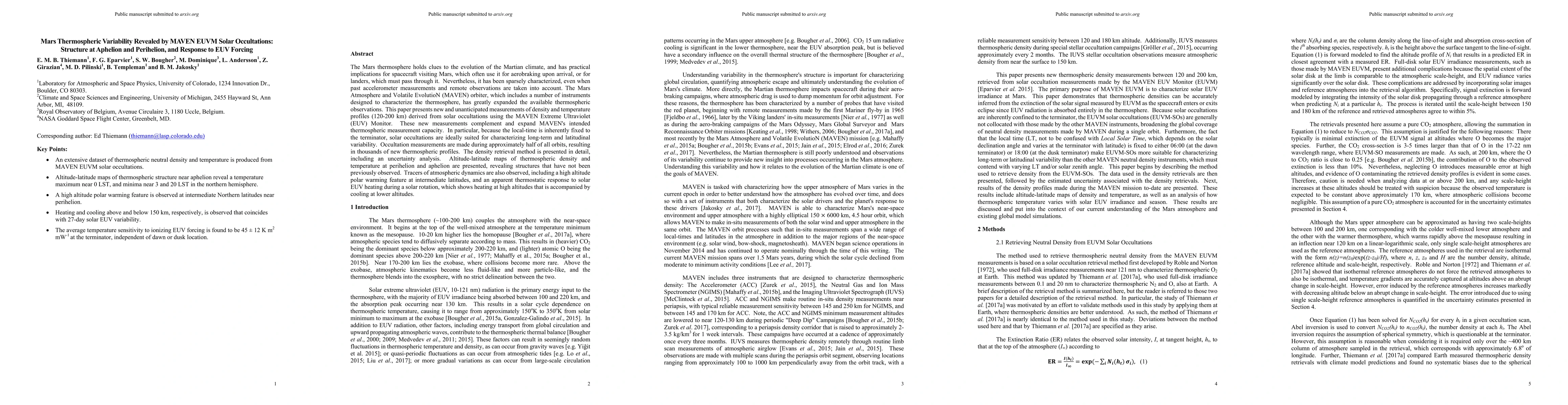 This paper uses MAVEN EUVM solar occultations to reveal new thermospheric density and temperature profiles for Mars, highlighting previously unseen structures at aphelion and perihelion. It observes a polar warming feature and a thermostatic response to EUV forcing, enhancing understanding of Mars' climate evolution and atmospheric dynamics.