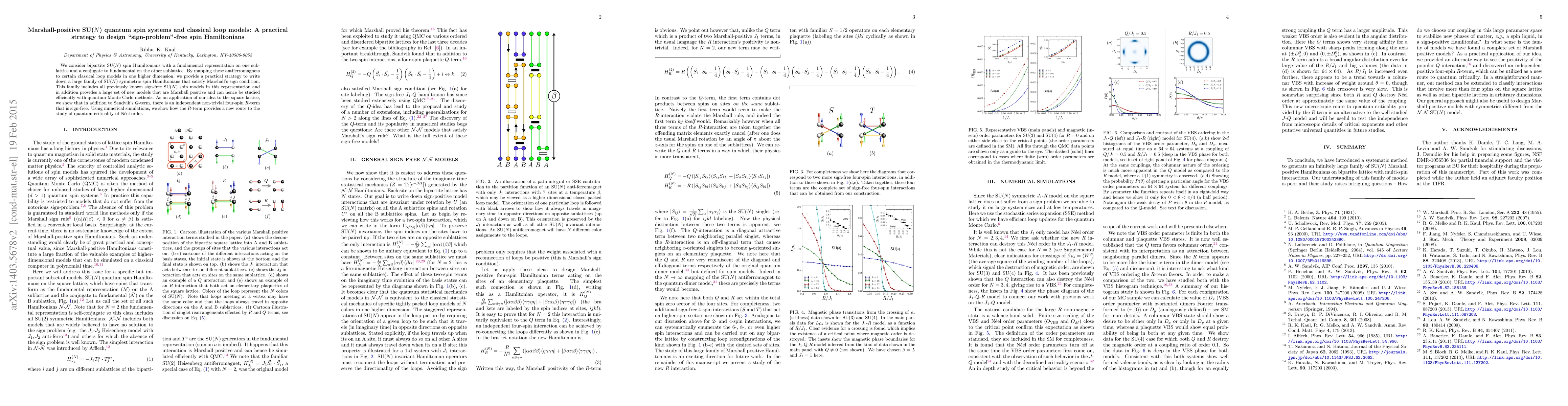 This paper proposes a method to construct Marshall-positive SU($N$) spin Hamiltonians by mapping bipartite SU($N$) spin systems to classical loop models, enabling the design of sign-problem-free Hamiltonians for quantum Monte Carlo simulations. It introduces a new four-spin $R$-term alongside Sandvik's $Q$-term, demonstrating a new approach to studying quantum criticality of N\'eel order.