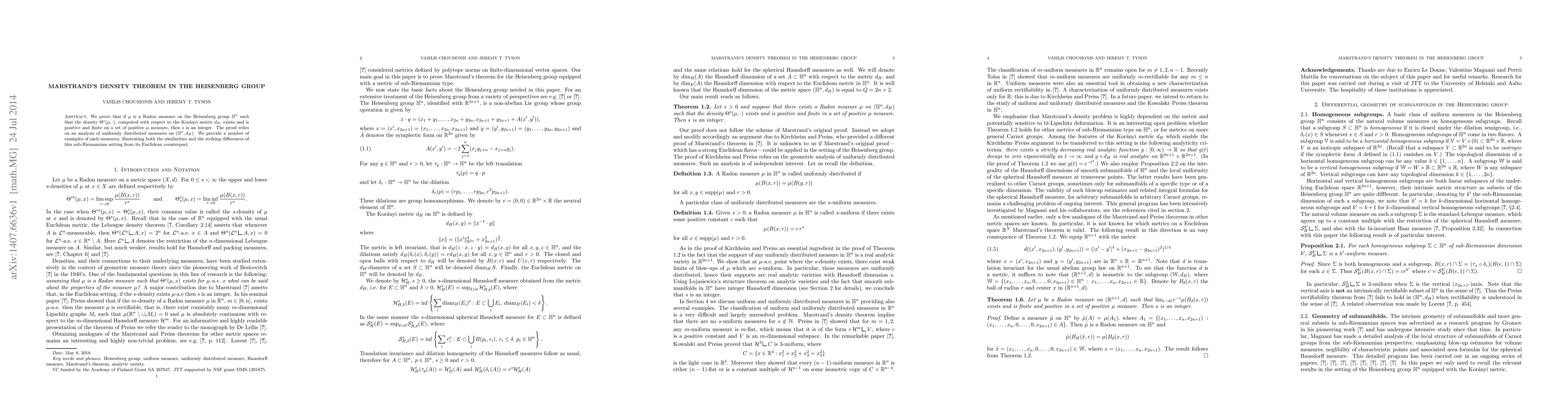 This research proves that in the Heisenberg group, if a Radon measure's density exists, is positive, and finite on a set of positive measure, then the dimension must be an integer. The proof uses uniformly distributed measures on the Heisenberg group with Korányi metric, and the paper also presents examples illustrating similarities and differences from Euclidean geometry.