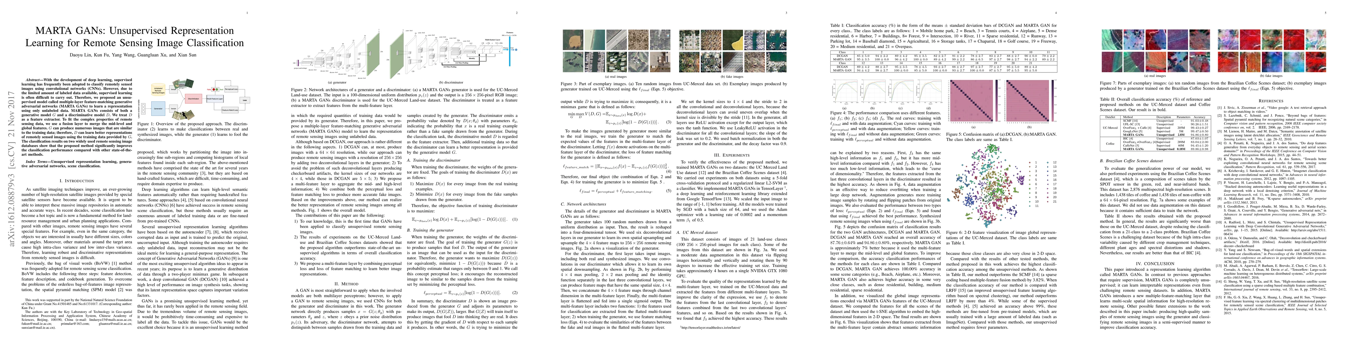This paper proposes MARTA GANs, an unsupervised learning model for remote sensing image classification using only unlabeled data. It employs a generative adversarial network with a fusion layer to extract and match features, significantly improving classification performance over supervised methods.