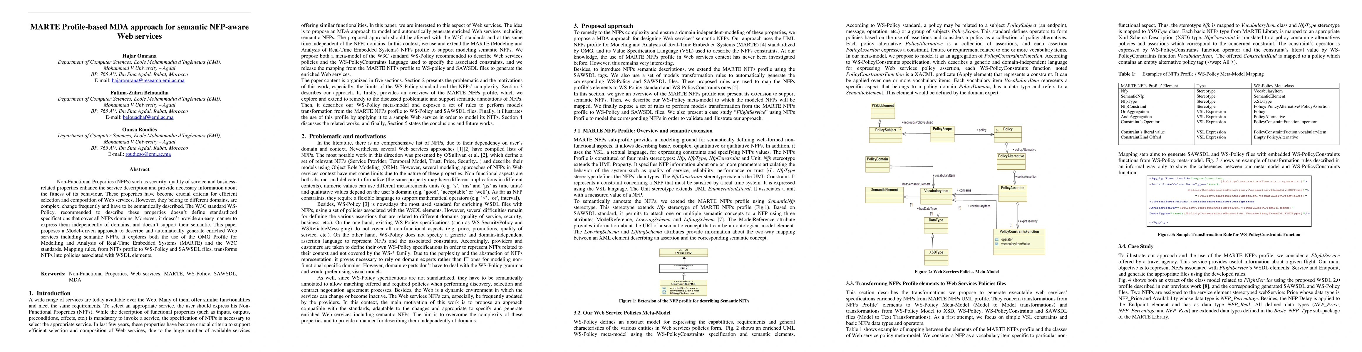 This paper proposes a model-driven approach using the MARTE profile to semantically describe and generate enriched Web services based on complex, frequently changing Non Functional Properties (NFPs). It introduces mapping rules to transform NFPs into policies associated with WSDL elements, addressing the limitations of existing WS-Policy standards.