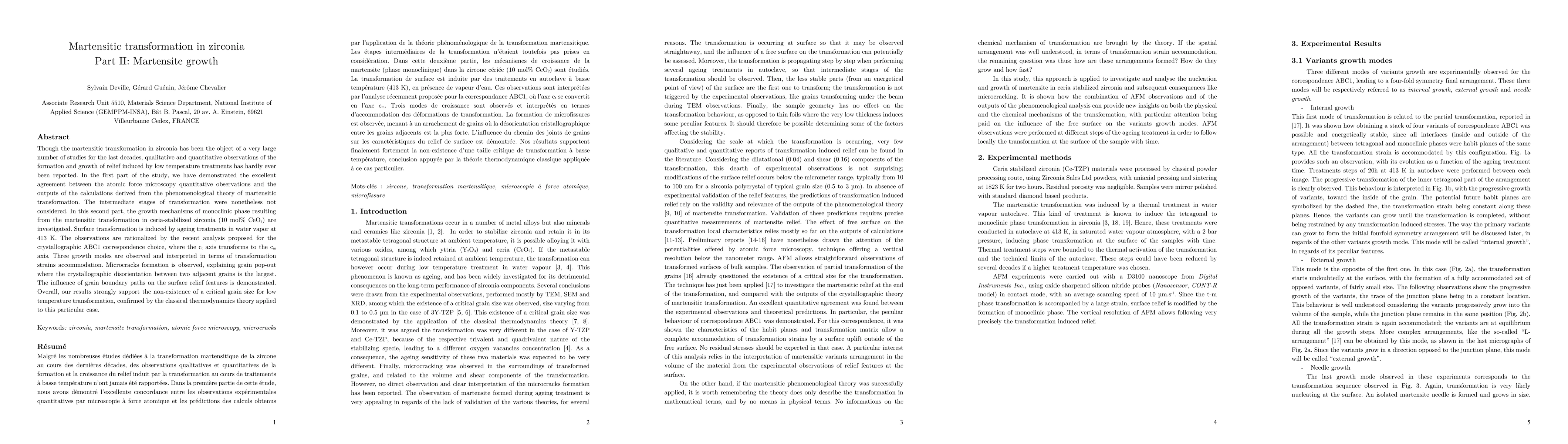 This paper investigates the growth mechanisms of the monoclinic phase in ceria-stabilized zirconia through martensitic transformation, revealing three growth modes and the role of transformation strains accommodation. Microcracks and grain pop-out are observed, highlighting the influence of grain boundary paths on surface relief features, and confirming the absence of a critical grain size for low-temperature transformation.
