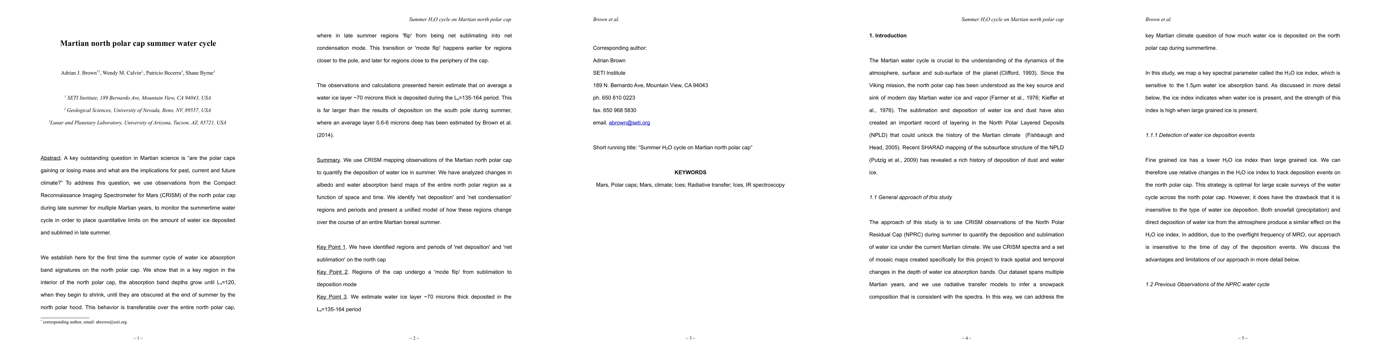 This paper investigates the Martian north polar cap's summer water cycle using CRISM observations, revealing a seasonal "mode flip" where regions transition from sublimation to condensation. It estimates a significant water ice deposition of ~70 microns during late summer, contrasting sharply with the minimal deposition observed on the south pole.