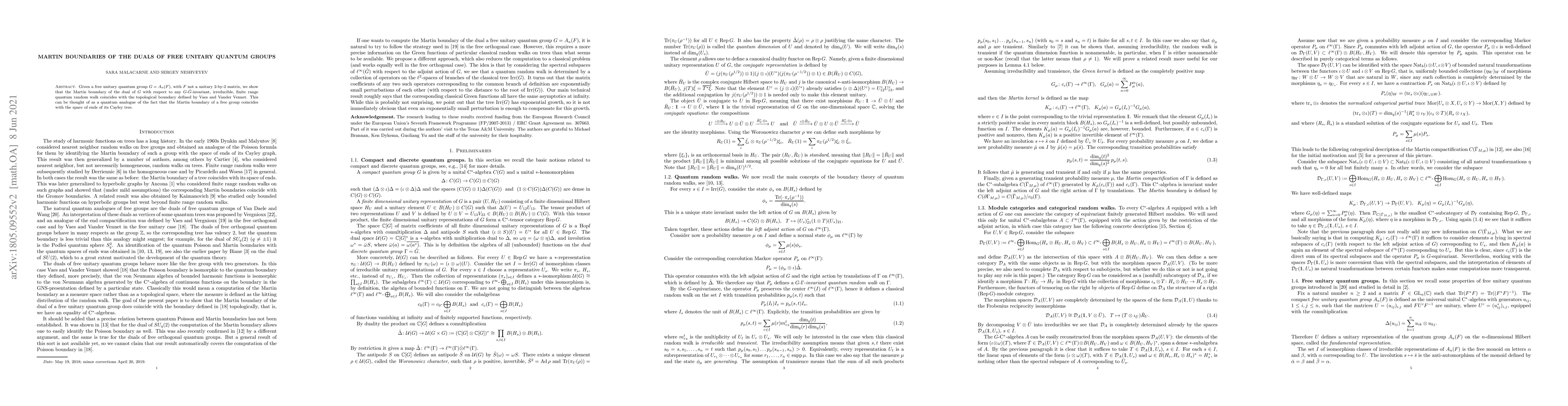 Given a free unitary quantum group $G=A_u(F)$, with $F$ not a unitary $2$-by-$2$ matrix, we show that the Martin boundary of the dual of $G$ with respect to any $G$-$\hat G$-invariant, irreducible, finite range quantum random walk coincides with the topological boundary defined by Vaes and Vander Vennet. This can be thought of as a quantum analogue of the fact that the Martin boundary of a free group coincides with the space of ends of its Cayley tree.