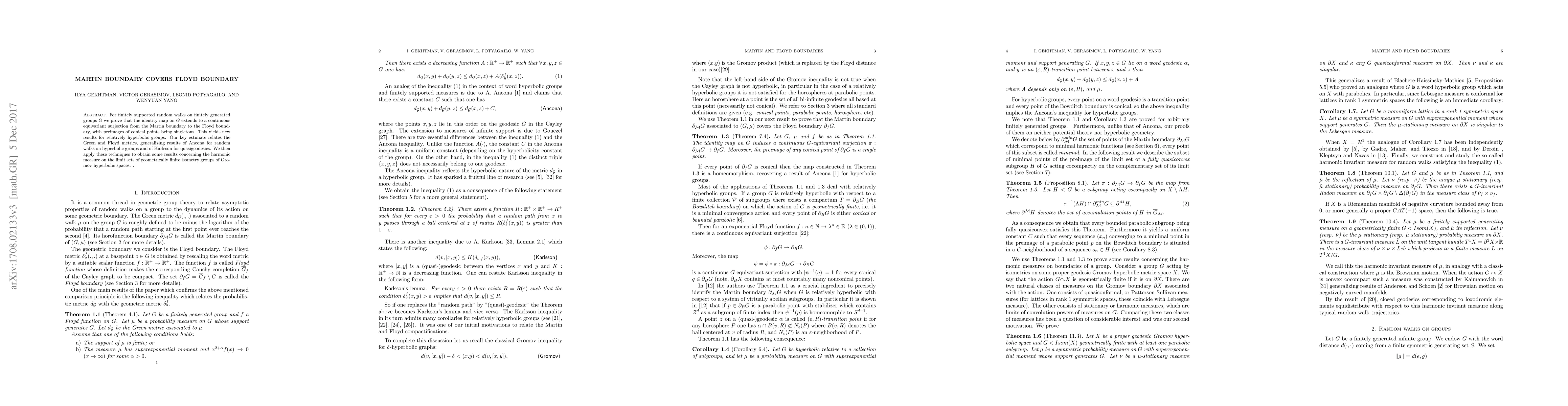 For finitely supported random walks on finitely generated groups $G$ we prove that the identity map on $G$ extends to a continuous equivariant surjection from the Martin boundary to the Floyd boundary, with preimages of conical points being singletons. This yields new results for relatively hyperbolic groups. Our key estimate relates the Green and Floyd metrics, generalizing results of Ancona for random walks on hyperbolic groups and of Karlsson for quasigeodesics. We then apply these techniques to obtain some results concerning the harmonic measure on the limit sets of geometrically finite isometry groups of Gromov hyperbolic spaces. .