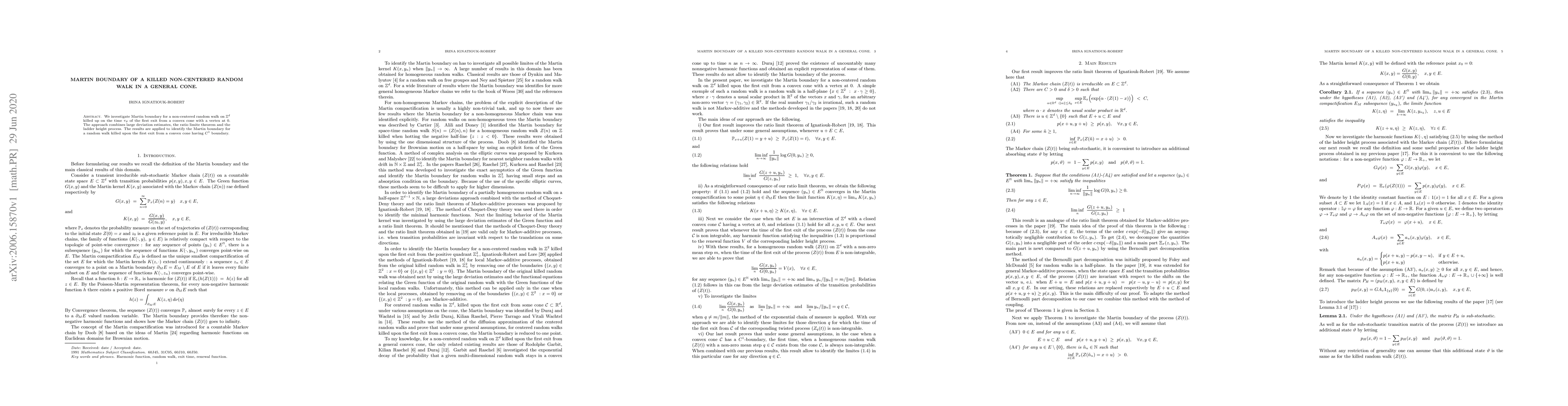 We investigate Martin boundary for a non-centered random walk on ${\mathbb Z}^d$ killed up on the time $\tau_\vartheta$ of the first exit from a convex cone with a vertex at $0$. The approach combines large deviation estimates, the ratio limite theorem and the ladder height process. The results are applied to identify the Martin boundary for a random walk killed upon the first exit from a convex cone having $C^1$ boundary.