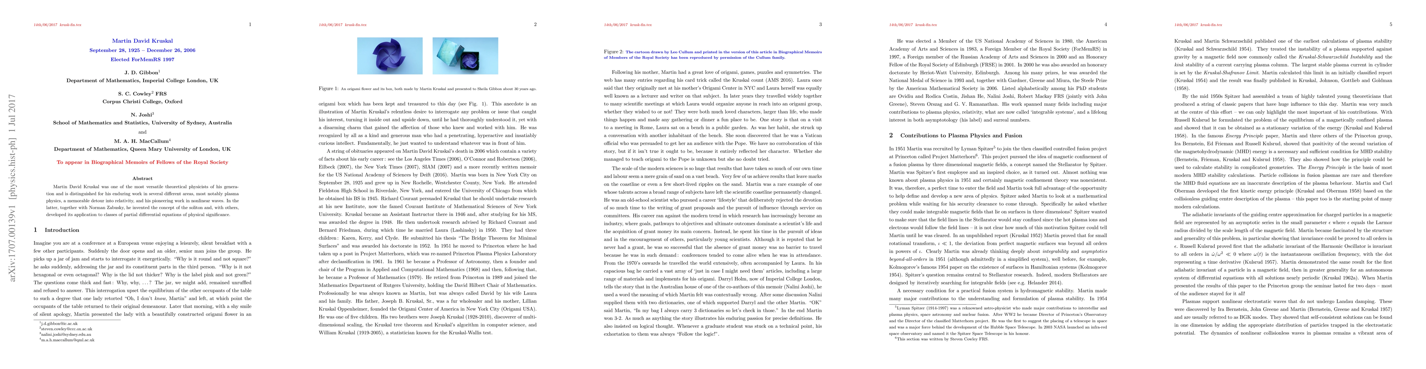 Martin David Kruskal was one of the most versatile theoretical physicists of his generation and is distinguished for his enduring work in several different areas, most notably plasma physics, a memorable detour into relativity, and his pioneering work in nonlinear waves. In the latter, together with Norman Zabusky, he invented the concept of the soliton and, with others, developed its application to classes of partial differential equations of physical significance.
