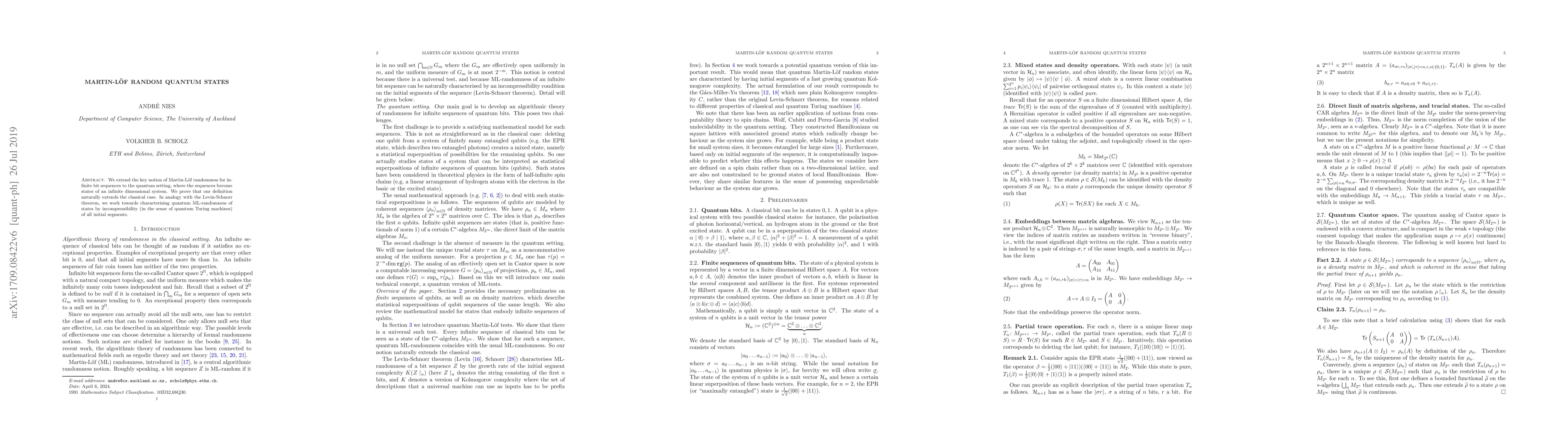 This paper extends the concept of Martin-Löf randomness from classical bit sequences to quantum states, aiming to characterize quantum ML-randomness through the incompressibility of all initial segments, analogous to the Levin-Schnorr theorem.