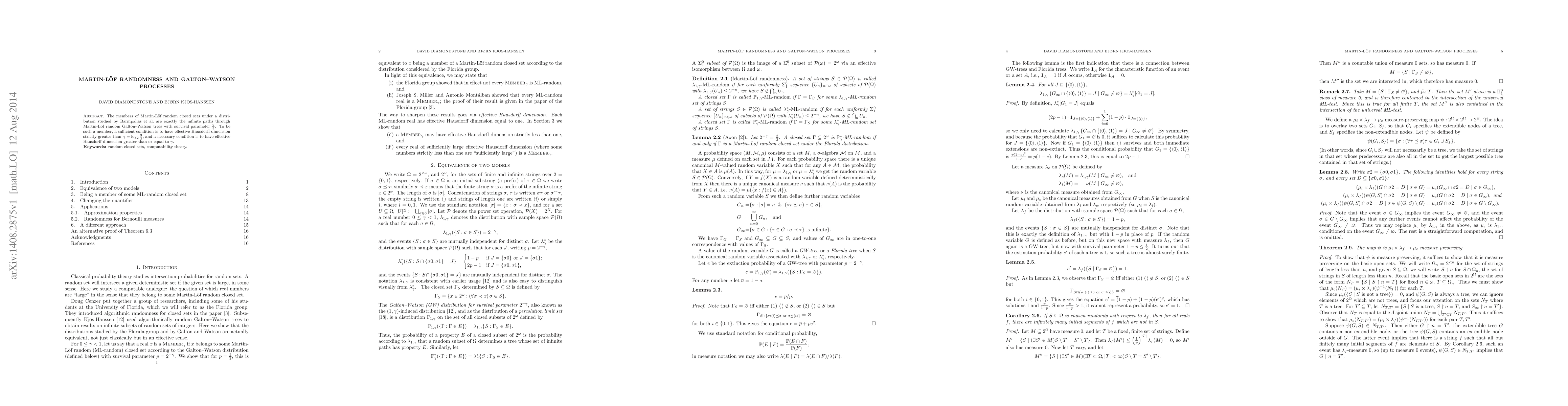 Summary: Martin-Löf random closed sets correspond to infinite paths in Martin-Löf random Galton-Watson trees with a survival parameter of 2/3. A set is such a member if its effective Hausdorff dimension exceeds γ = log₂(3/2), though it must be at least γ to be a member.