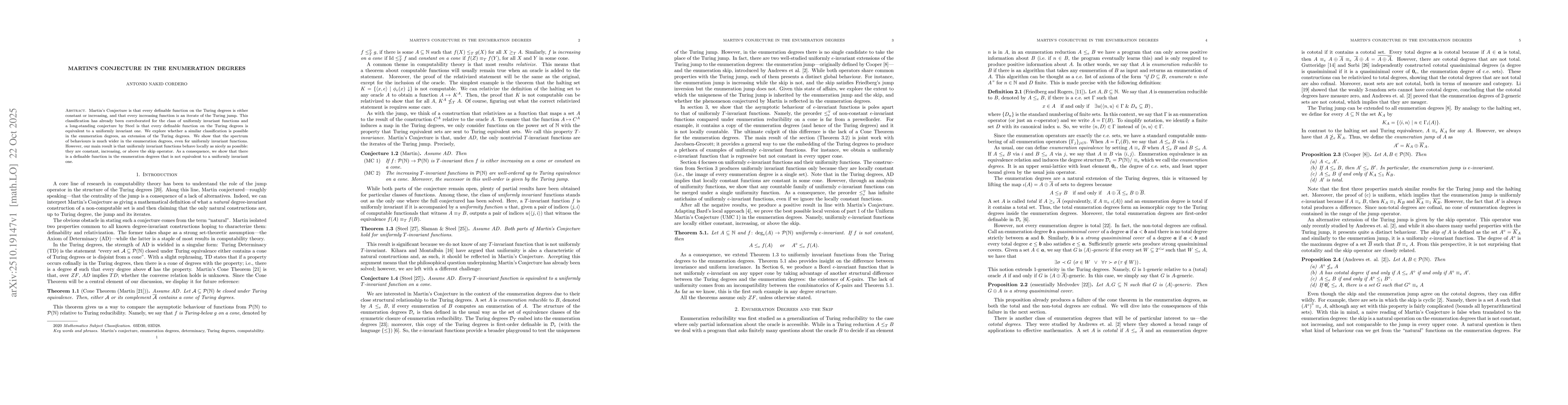 The research employs a combination of mathematical logic and computability theory, focusing on the enumeration degrees and their properties. It involves analyzing the structure of e-invariant functions, their uniformity, and interactions with jump operators and skip operators within the enumeration degrees framework.