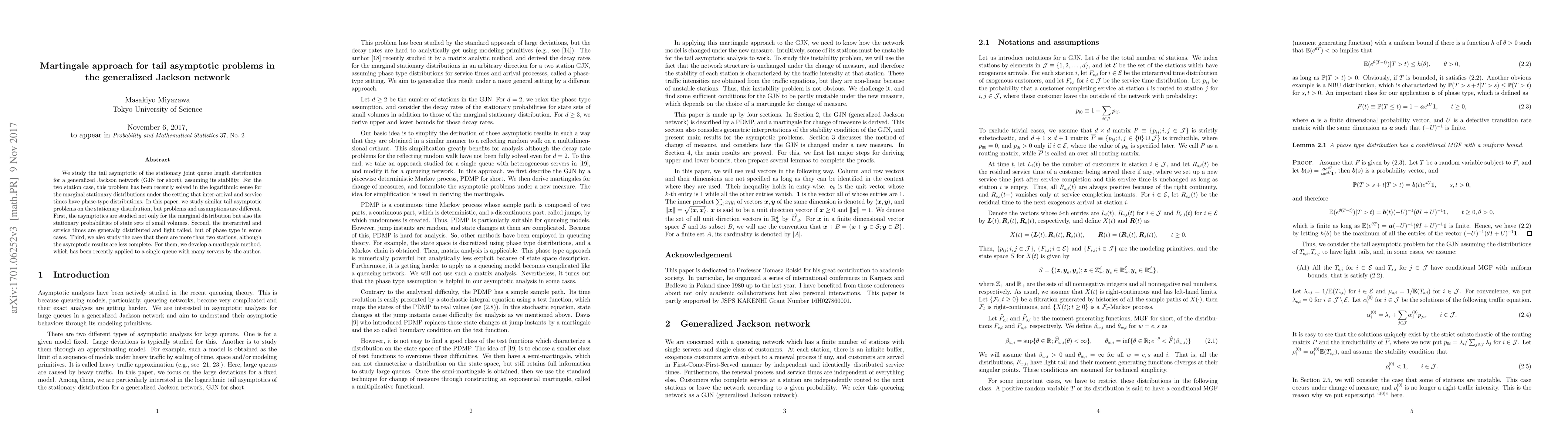 This paper investigates the tail asymptotic behavior of the stationary joint queue length distribution in a generalized Jackson network, focusing on marginal distributions and probabilities of small state set volumes. It employs a martingale method to address interarrival and service times that are generally distributed but can be of phase type, extending beyond the two-station case.