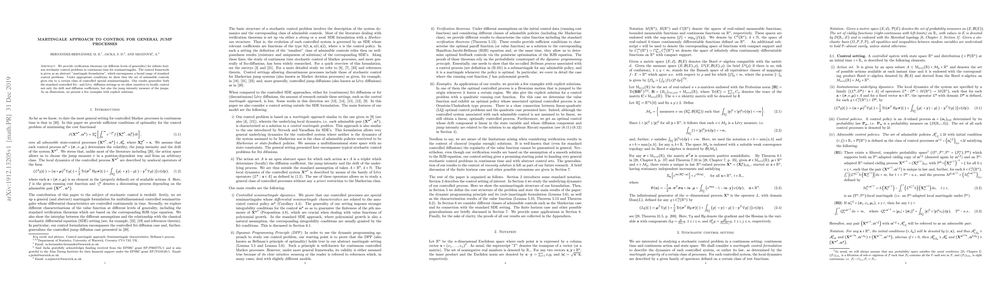 We provide verification theorems (at different levels of generality) for infinite horizon stochastic control problems in continuous time for semimartingales. The control framework is given as an abstract "martingale formulation", which encompasses a broad range of standard control problems. Under appropriate conditions we show that the set of admissible controls gives rise to a certain class of controlled special semimartingales. Our results generalise both the standard controlled It\^o- and L\'evy-diffusion settings as we allow ourselves to locally control not only the drift and diffusion coefficients, but also the jump intensity measure of the jumps. As an illustration, we present a few examples with explicit solutions.