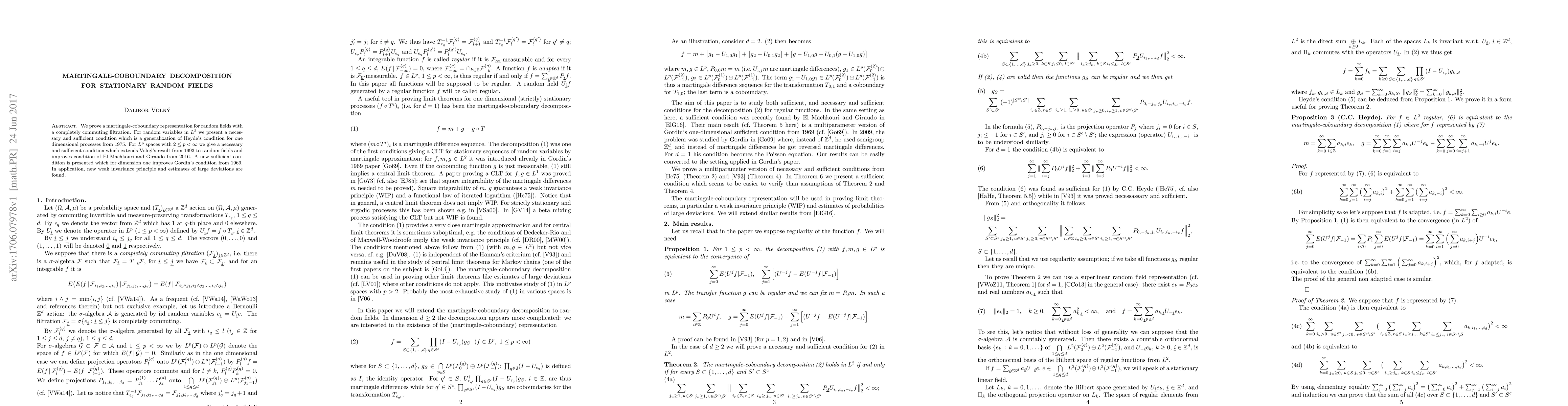 This paper establishes a martingale-coboundary decomposition for stationary random fields with a completely commuting filtration, extending previous results for one-dimensional processes and improving existing conditions for Lp spaces. It also provides new weak invariance principles and large deviation estimates.