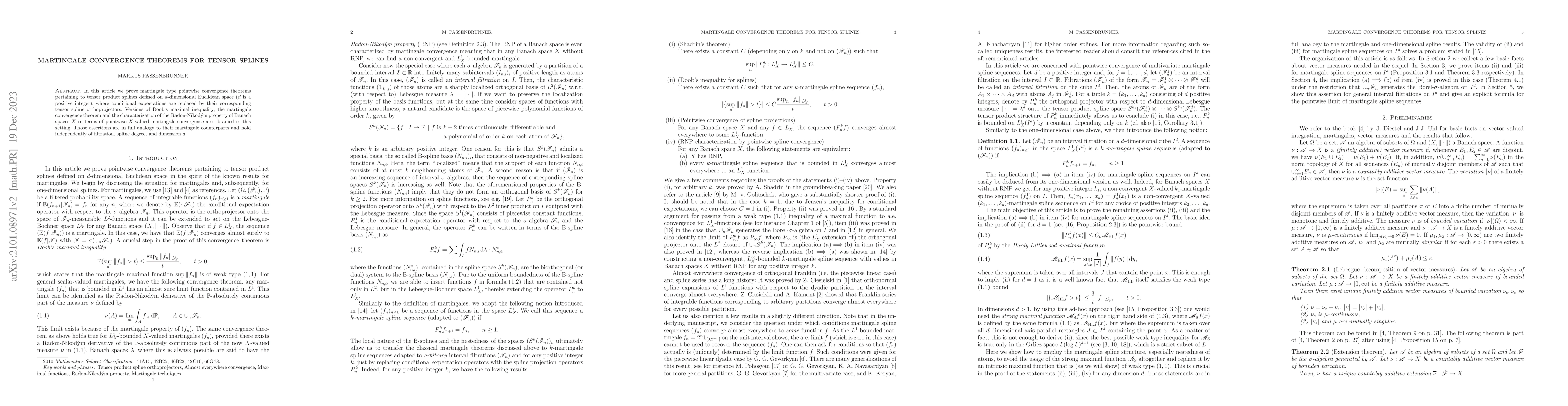 This paper proves martingale convergence theorems for tensor product splines in $d$-dimensional Euclidean space, replacing conditional expectations with tensor spline orthoprojectors. It establishes versions of Doob's maximal inequality and the martingale convergence theorem, holding independently of filtration, spline degree, and dimension.