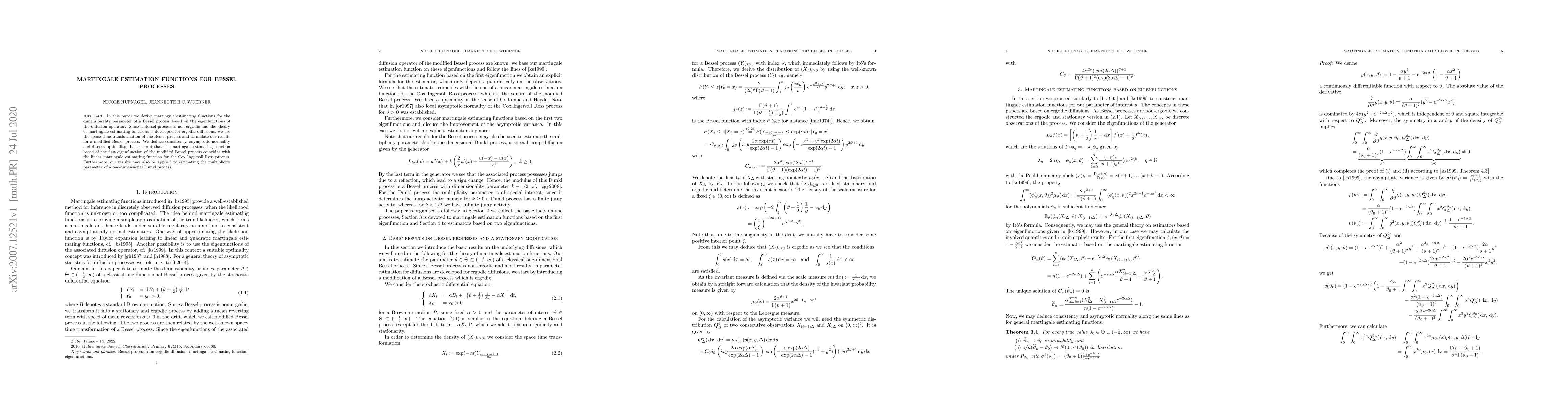 This paper develops martingale estimating functions for the dimensionality parameter of Bessel processes, adapting techniques for ergodic diffusions to non-ergodic Bessel processes via a space-time transformation. The study finds consistency, asymptotic normality, and optimality, revealing a connection to the Cox Ingersoll Ross process and potential applications to Dunkl processes.